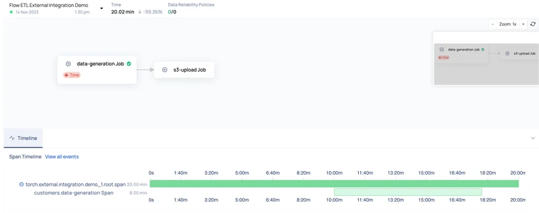 #Creating Job bounded by spanjob_uid="customers.data-generation"inputs=[]outputs=[Node(job_uid='customers.s3-upload')]job_span_uid=f'{job_uid} Span'job = CreateJob( uid="job_uid", name=f'{job_uid} Job', pipeline_run_id=pipeline_run.id, description=f'{job_uid} created using torch job decorator', inputs=inputs, outputs=outputs, bounded_by_span=True, span_uid=job_span_uid, with_explicit_time=True )created_job = pipeline_run.create_job(job)job_span_context = pipeline_run.get_span(job_span_uid)job_span_context.start(created_at= datetime(2023, 11, 14, 13, 40, 1))job_span_context.send_event(GenericEvent(context_data={'Size':100, 'total_file': 1, 'schema': 'name,address,dept_id'}, event_uid="customers.data.generation.metadata", created_at=datetime(2023, 11, 14, 13, 45, 1)))job_span_context.end(created_at=datetime(2023, 11, 14, 13, 48, 1))- Updating pipeline run with explicit times: To end the pipeline run with historical time, the
