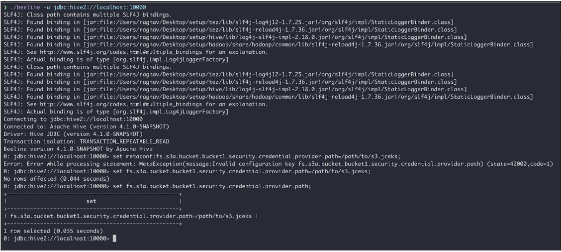 set fs.s3a.security.credential.provider.path=jceks://hdfs@<ActiveNameNode>:<port>/user/backup/s3.jceks;set metaconf:fs.s3a.security.credential.provider.path=jceks://hdfs@<ActiveNameNode>:<port>/user/backup/s3.jceks;The property hadoop.security.credential.provider.path is global to all filesystems and secrets. There is another property, fs.s3a.security.credential.provider.path which only lists credential providers for S3A filesystems. The two properties are combined into one, with the list of providers in the fs.s3a. property takes precedence over that of the hadoop.security list (i.e. they are prepended to the common list).