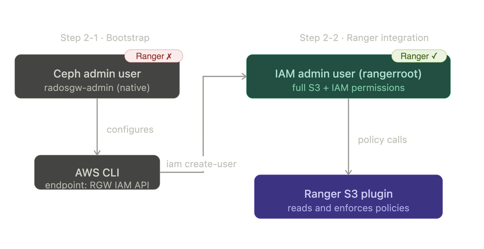 | IAM User | iam create-user (AWS CLI) | Ranger policy enforcement via RGW IAM API | ✅ Yes |