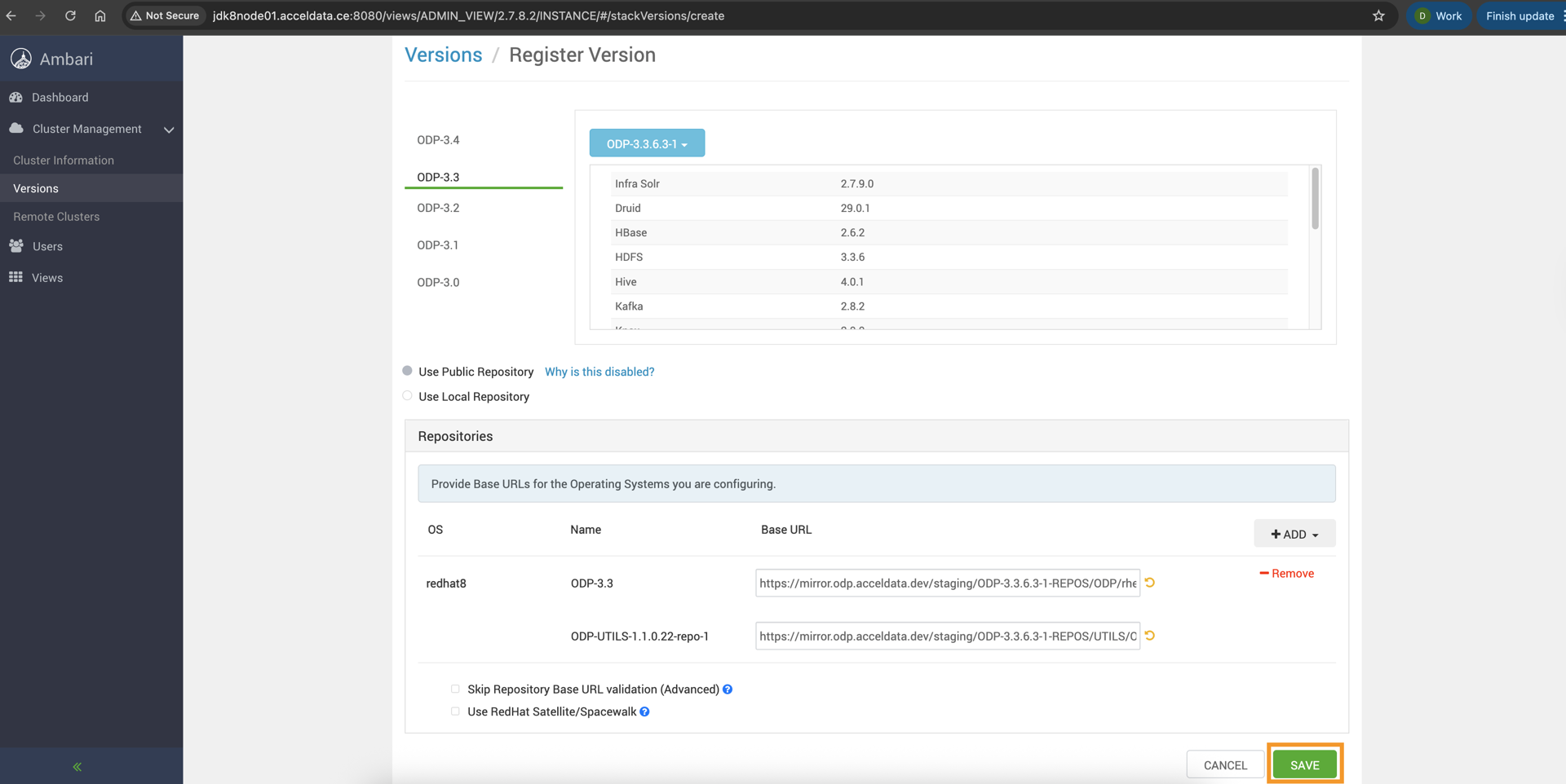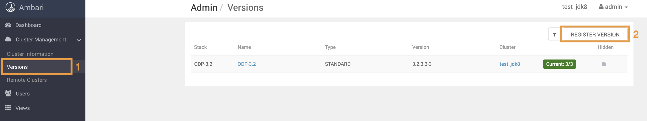 - Navigate to the Versions option on the left side and click REGISTER VERSION to add a new ODP Release.