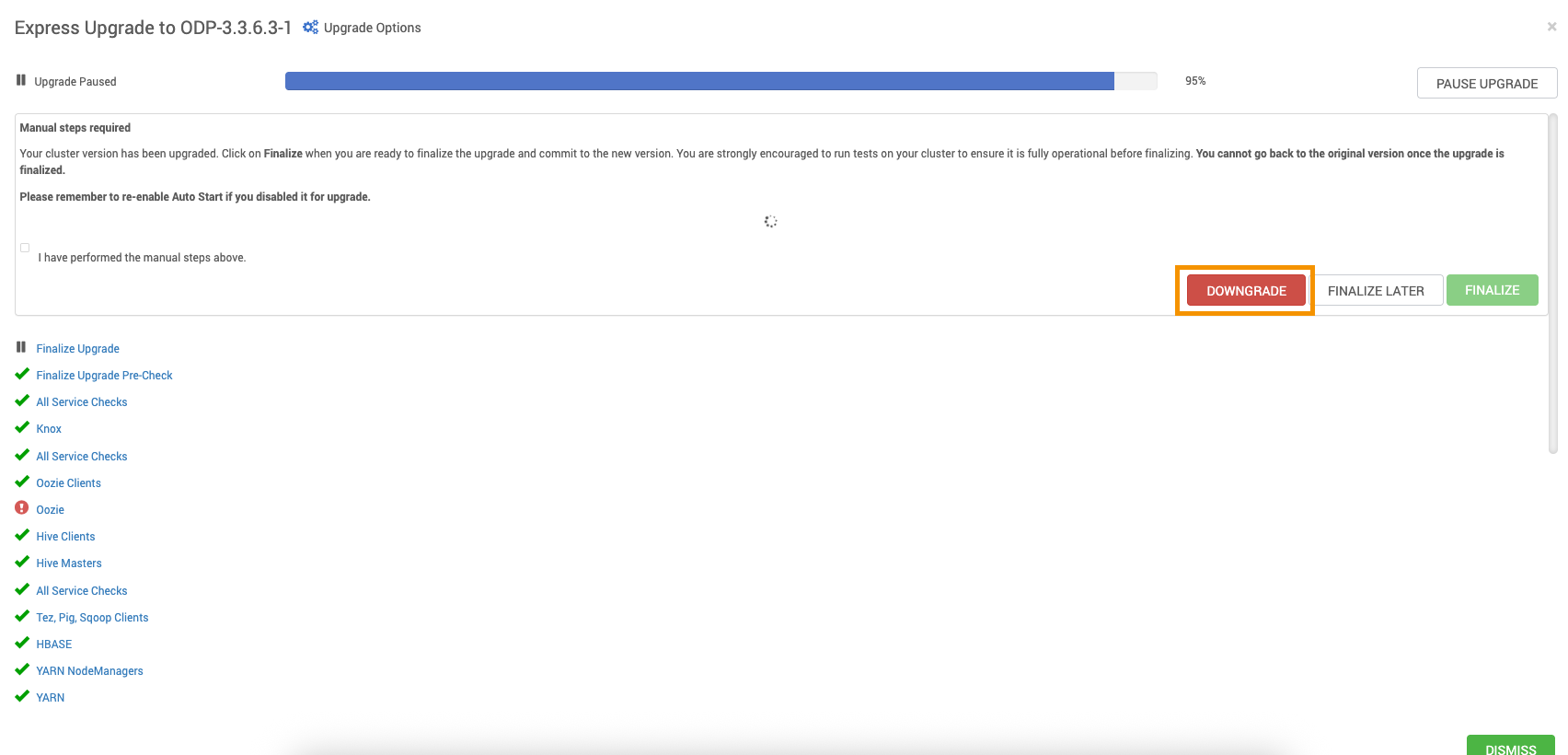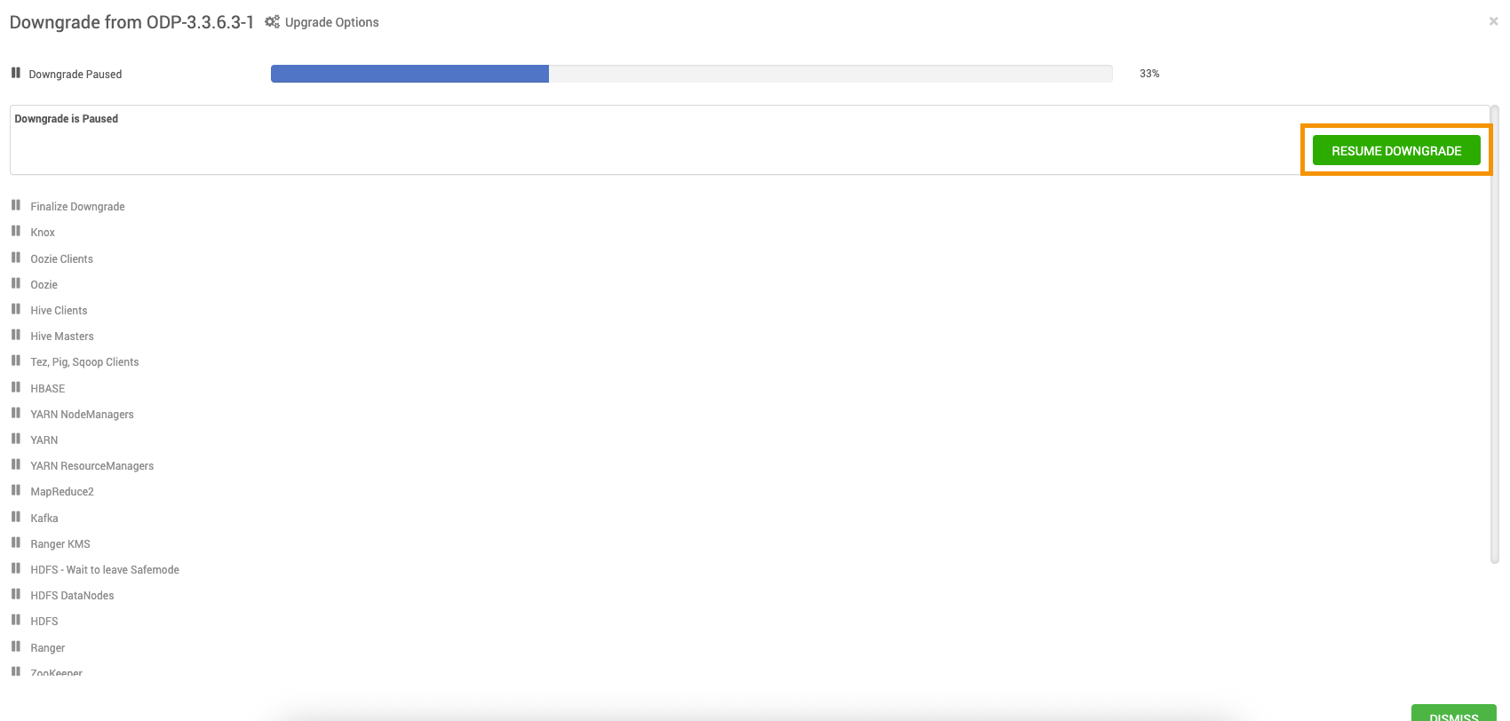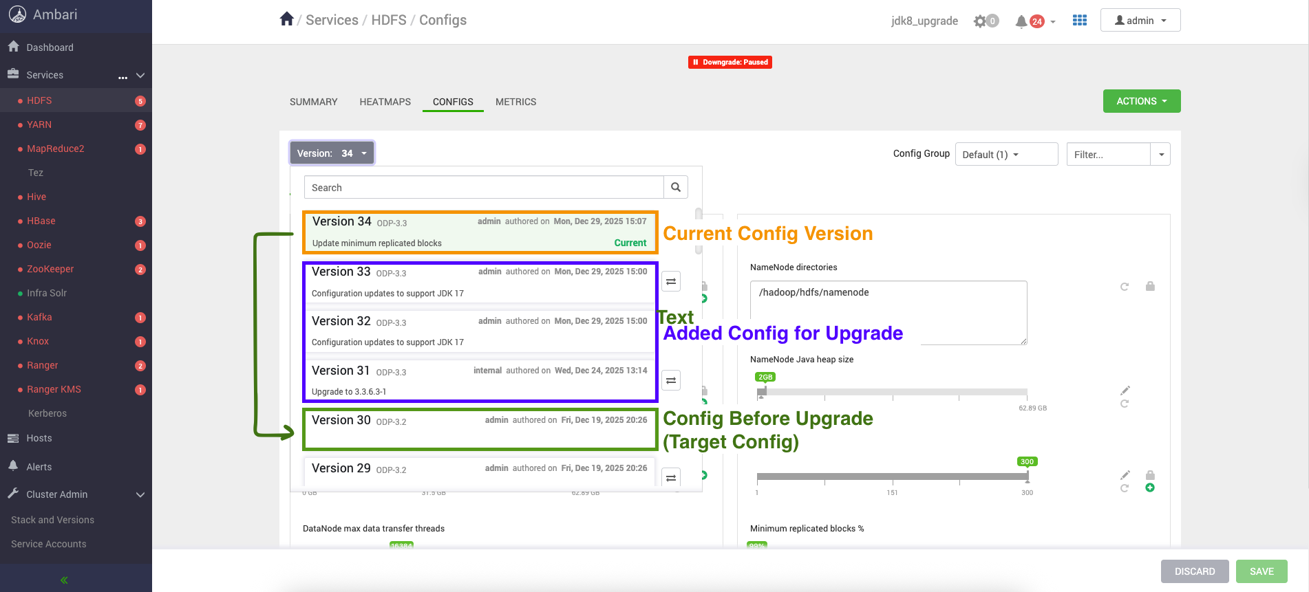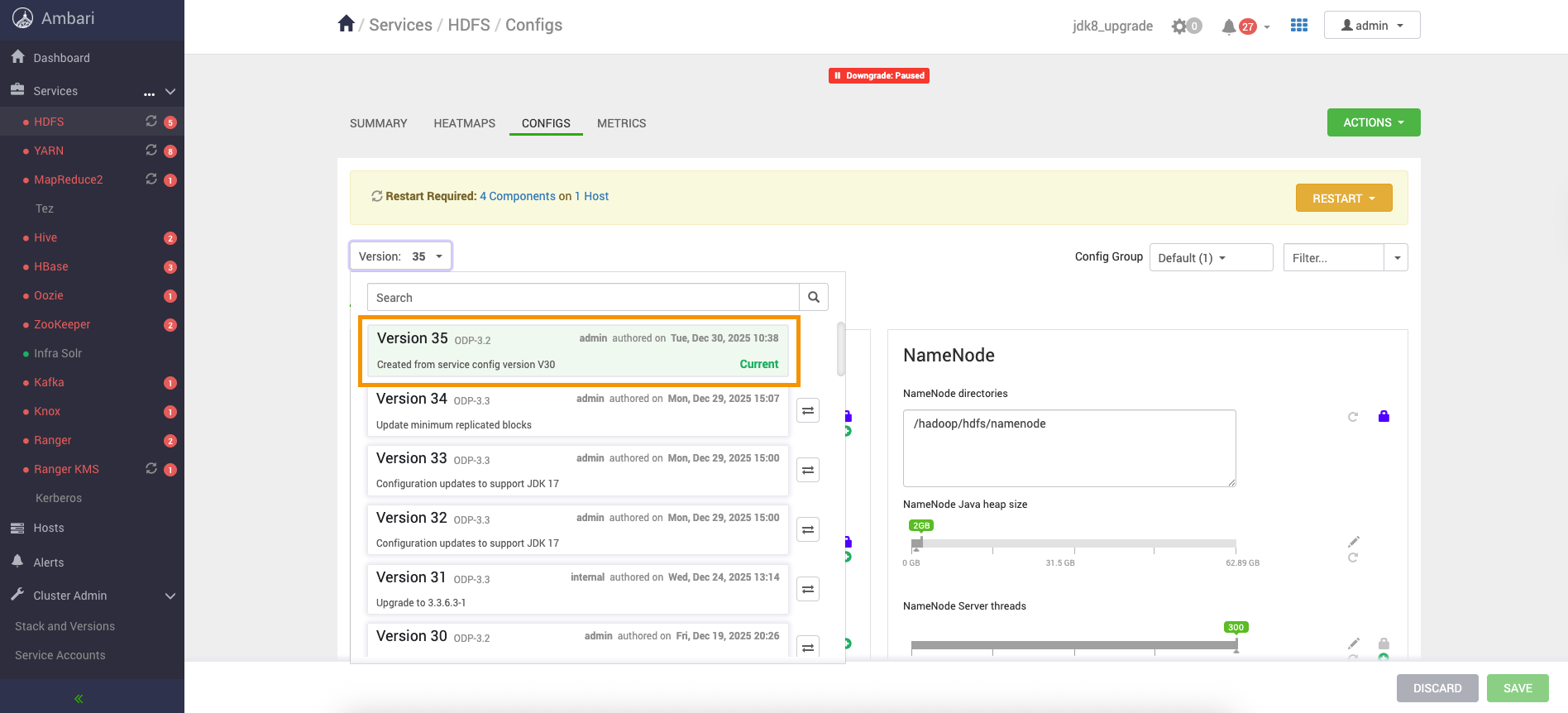 #Sat Aug 16 23:08:17 IST 2025namespaceID=2113890819clusterID=CID-089fc5ca-1bb7-458e-b63a-83ae0b4921e6cTime=1755365897253storageType=NAME_NODEblockpoolID=BP-1385487665-10.100.11.39-1755221846094layoutVersion=-66Retry the HDFS restart from the Downgrade page, and proceed further.