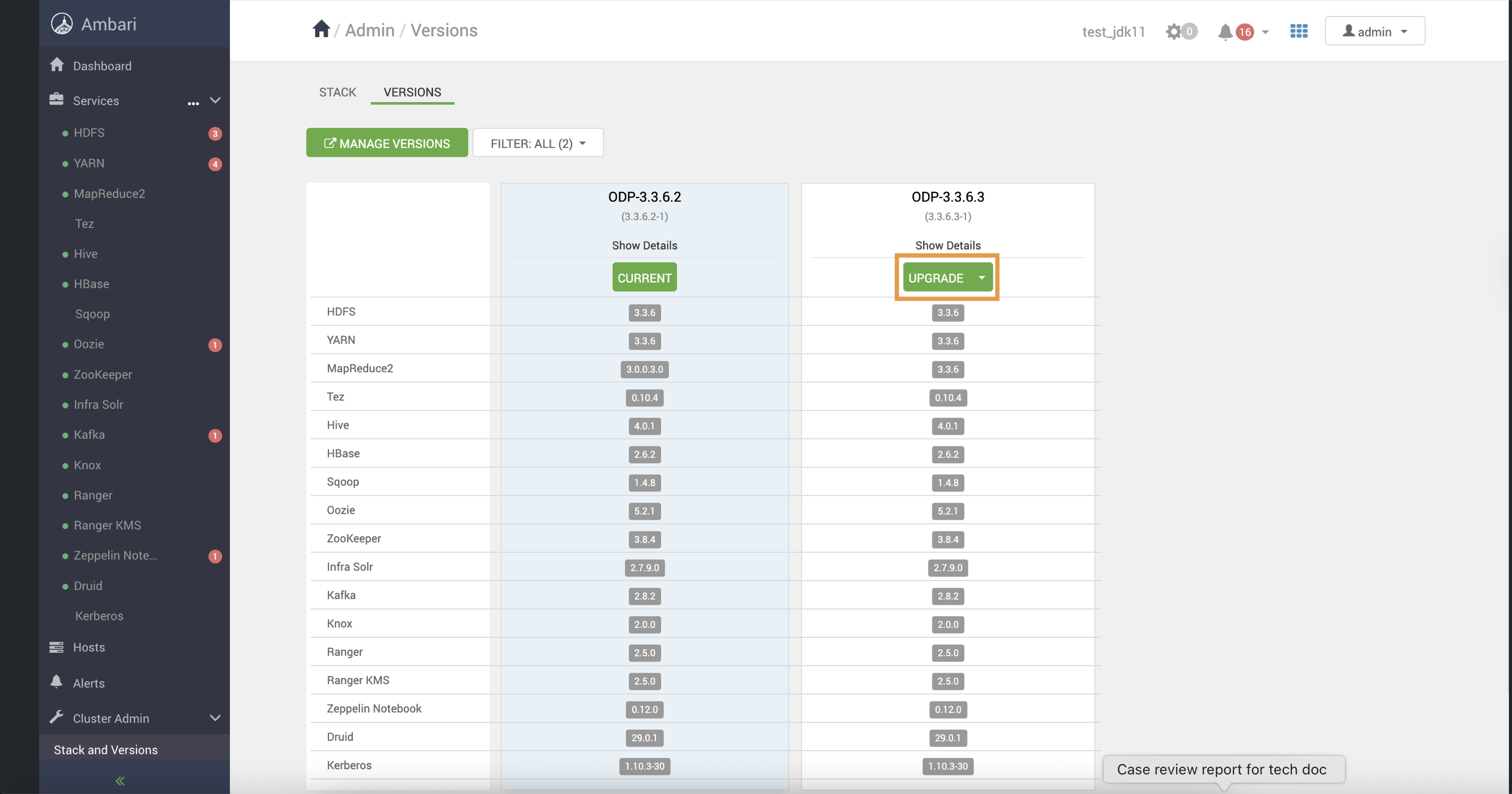 - On the Ambari UI, navigate to the Admin > Versions page and click Upgrade.