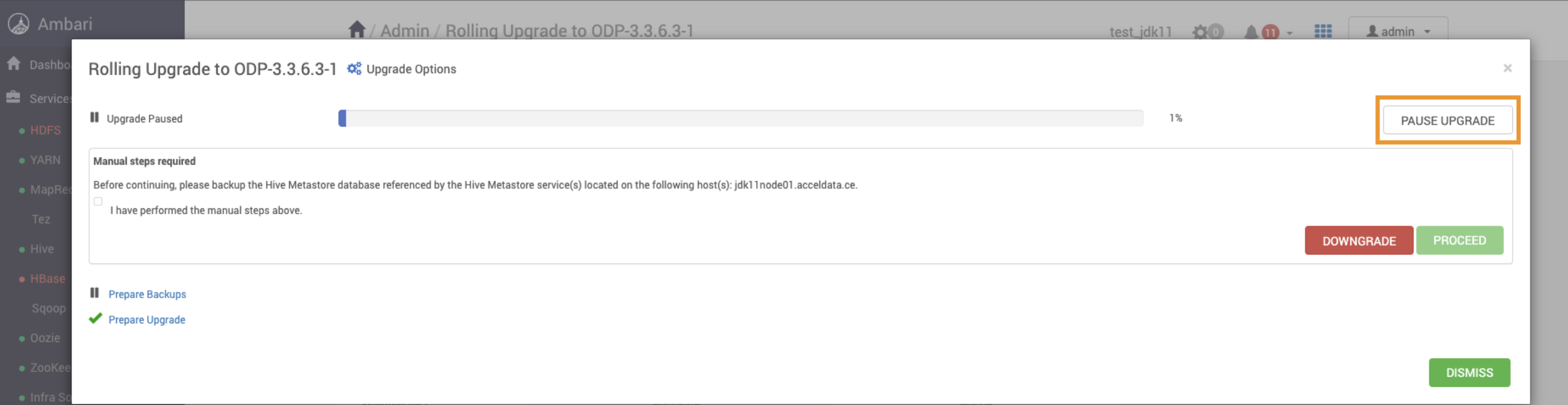 Before accepting Perform Backups, pause the upgrade and proceed to next Ambari Upgrade section