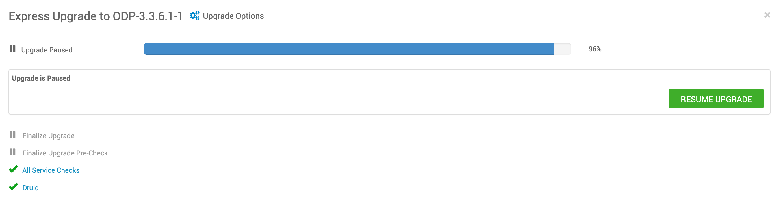 /usr/odp/current/zeppelin-server/bin/zeppelin-daemon.sh restart >> /var/log/zeppelin/zeppelin-setup.log- Resume the Express upgrade, complete, and finalize it.