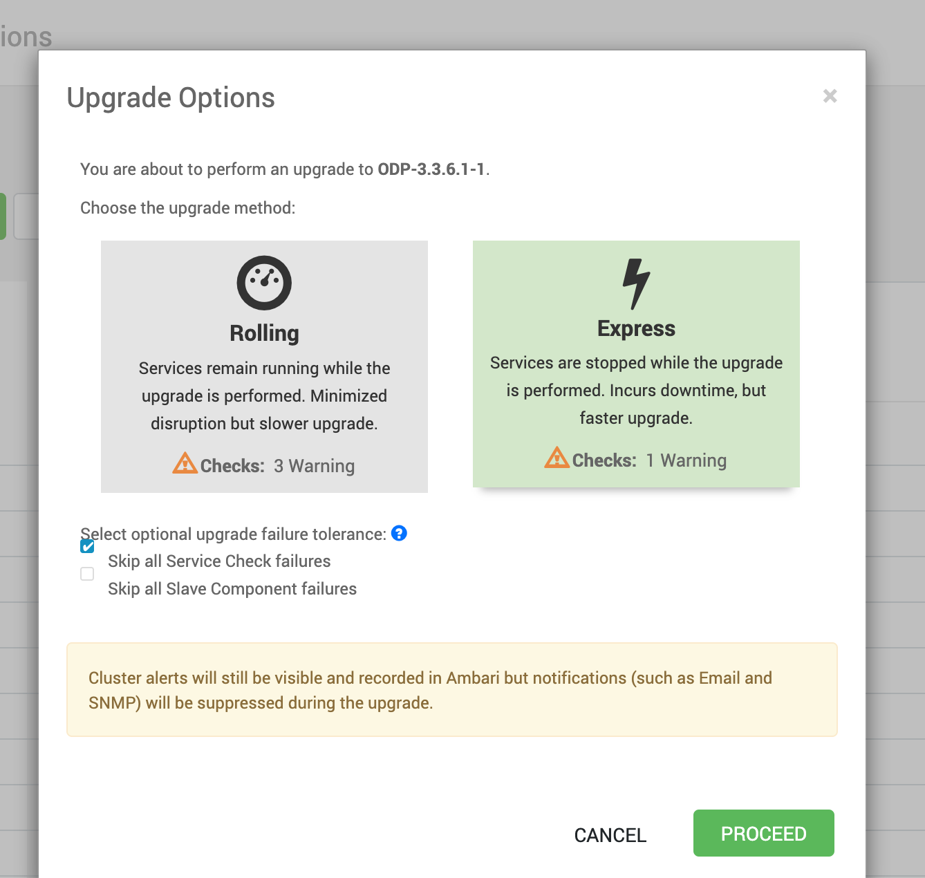 - Upon clicking Upgrade, the Upgrade Options such as Rolling and Express appear on the screen. In the Upgrade Options, select Express and click Proceed.
