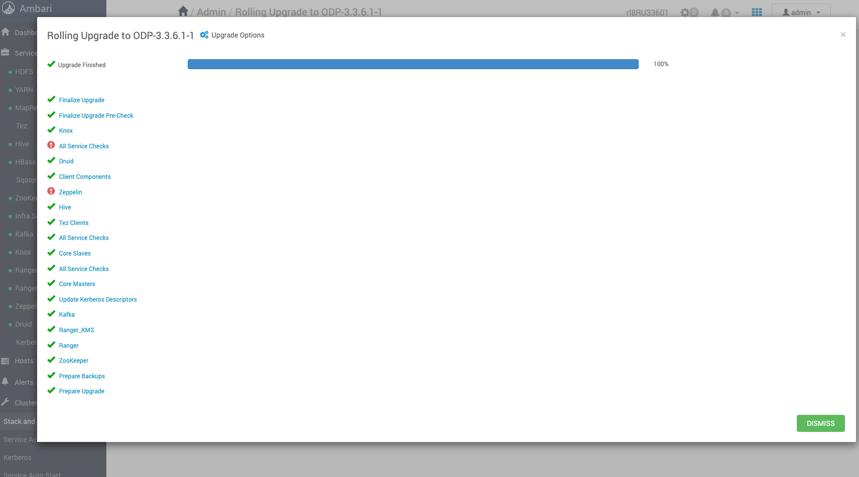 The screenshot below confirms the successful completion of the express upgrade to ODP version 3.3.6.1-1.