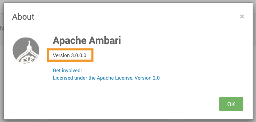 To verify the upgraded Ambari version, navigate to Admin → About in the top-right corner of the Ambari UI.