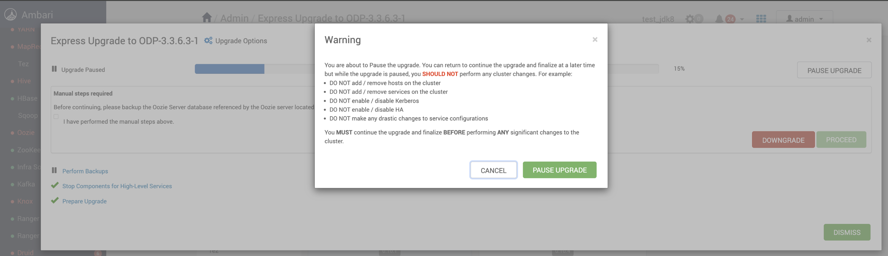 Before accepting Perform Backups, pause the ODP Express upgrade and proceed to the Ambari upgrade.