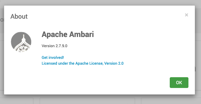 To verify the upgraded Ambari version, navigate to Admin → About in the top-right corner of the Ambari UI.