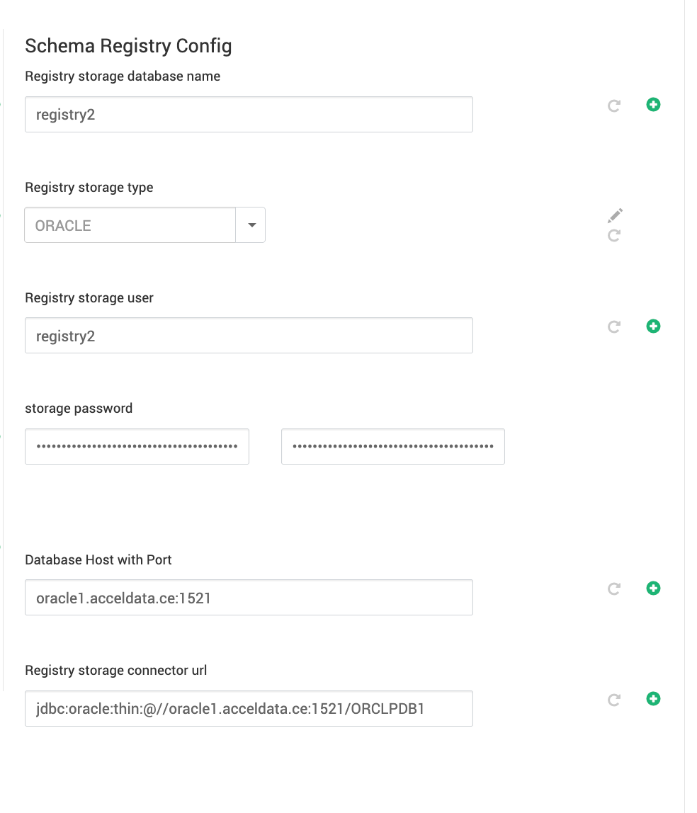 Set the properties as shown to set up Schema Registry with the Oracle database, in the SCHEMA REGISTRY CONFIGURATION section under Schema Registry Config.