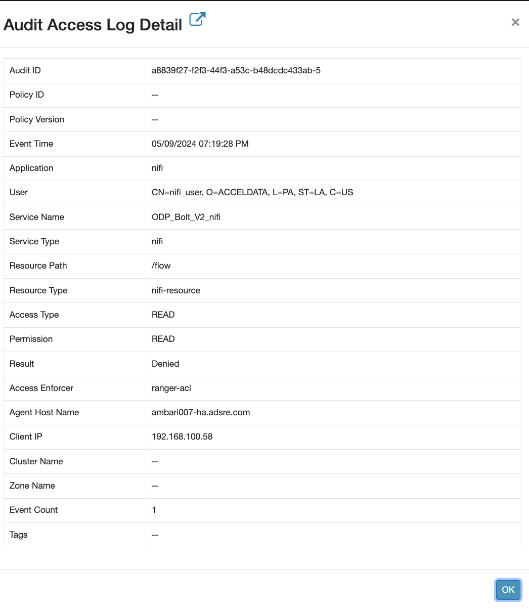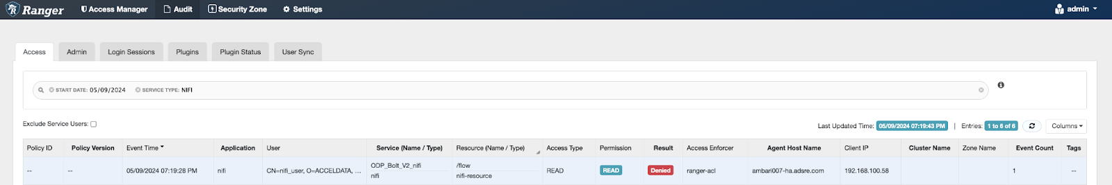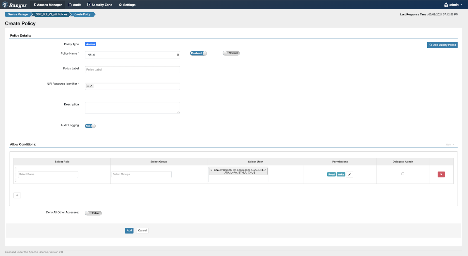 tailf /var/log/nifi/nifi-user.log<Rerun the Ranger NiFi Test connection>2024-05-09 19:04:27,916 INFO [NiFi Web Server-115] o.a.n.w.s.NiFiAuthenticationFilter Authentication Started 10.90.9.67 [CN=ambari007-ha.adsre.com, O=ACCELDATA, L=PA, ST=LA, C=US] GET https://ambari007-ha.adsre.com:9091/nifi-api/resources2024-05-09 19:04:27,916 INFO [NiFi Web Server-115] o.a.n.w.s.NiFiAuthenticationFilter Authentication Success [CN=ambari007-ha.adsre.com, O=ACCELDATA, L=PA, ST=LA, C=US] 10.90.9.67 GET https://ambari007-ha.adsre.com:9091/nifi-api/resources2024-05-09 19:04:27,924 INFO [NiFi Web Server-115] o.a.n.w.a.c.AccessDeniedExceptionMapper identity[CN=ambari007-ha.adsre.com, O=ACCELDATA, L=PA, ST=LA, C=US], groups[none] does not have permission to access the requested resource. No applicable policies could be found. Returning Forbidden response.Solution: Add Complete Certificate DN in Ranger User section and Add to Respective NiFi Policy.