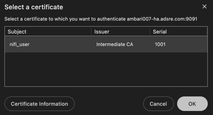 - When prompted by your browser, select the certificate you recently imported. Use incognito mode if the certificate prompt does not appear.