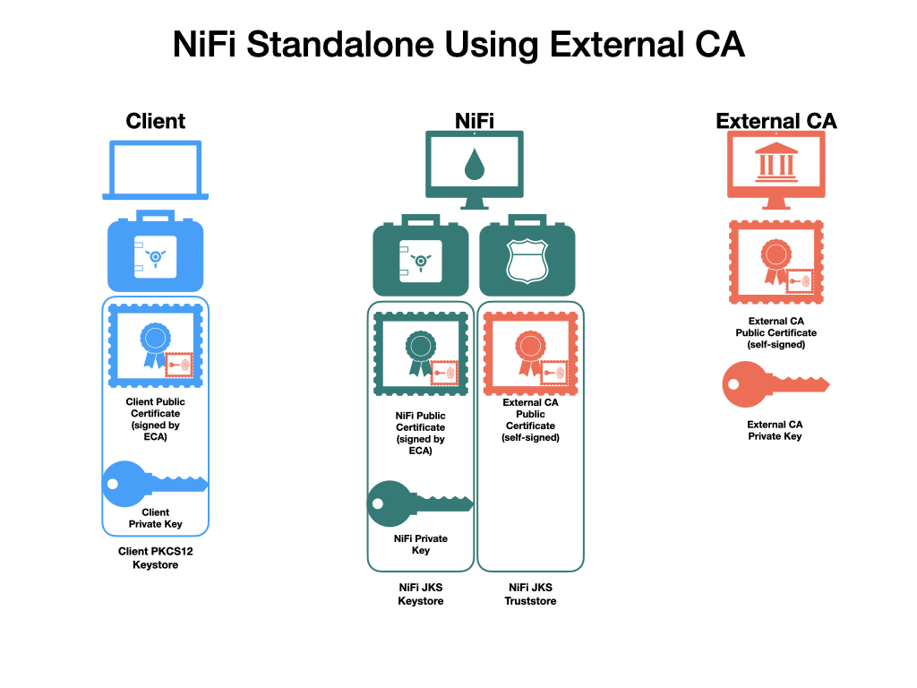 The final setup will include a self-signed external CA (the root), a keystore and truststore containing the necessary certificates for the NiFi instance to operate, and a client certificate for a human user to access NiFi.