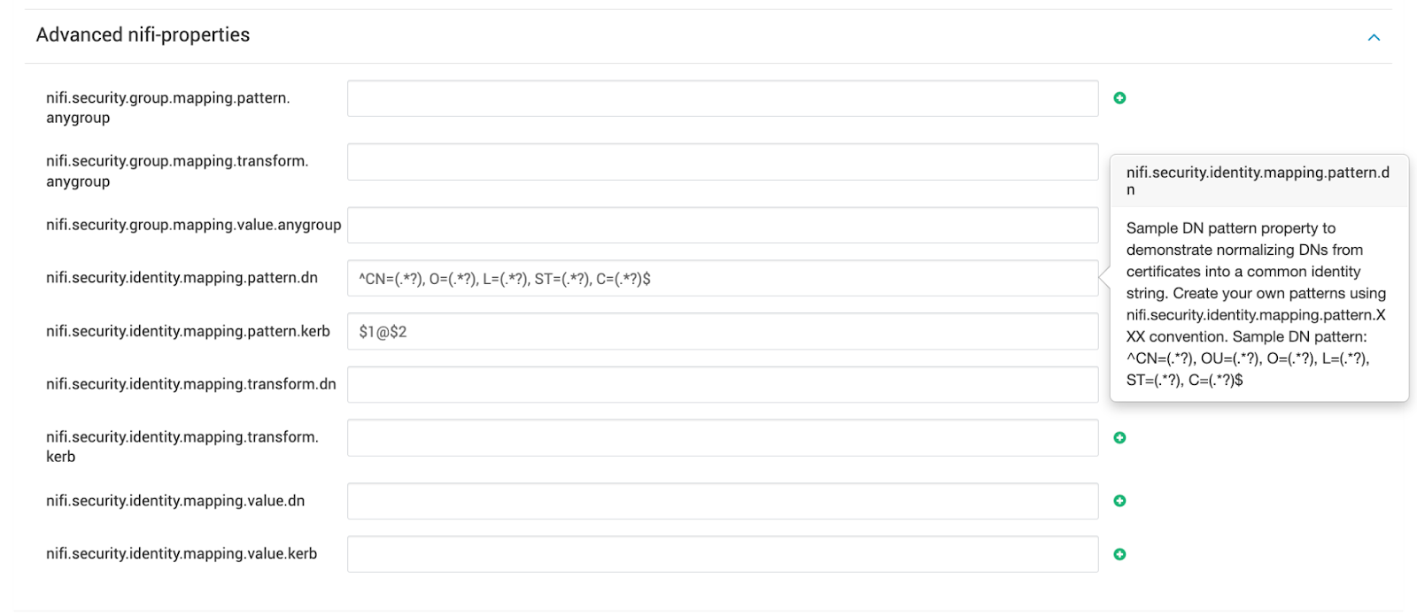 nifi.security.identity.mapping.pattern.dn=^CN=(.*?), OU=(.*?), O=(.*?), L=(.*?), ST=(.*?), C=(.*?)$nifi.security.identity.mapping.value.dn=$1@$2nifi.security.identity.mapping.pattern.kerb=^(.*?)/instance@(.*?)$nifi.security.identity.mapping.value.kerb=$1@$2