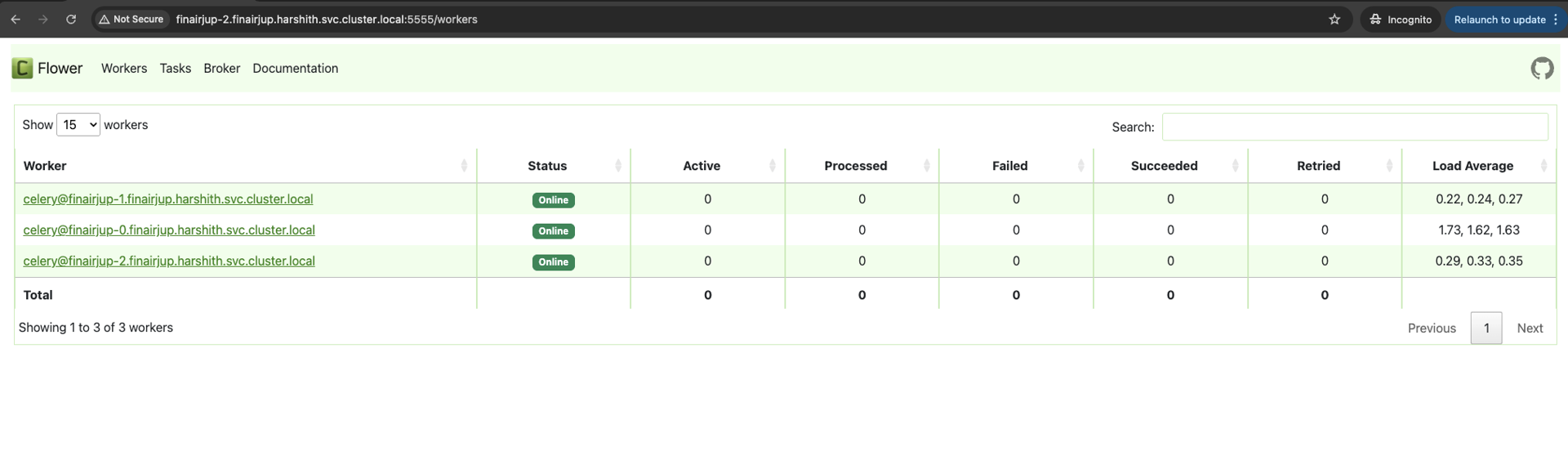- Accessing the Flower UI URL will prompt for username and password.