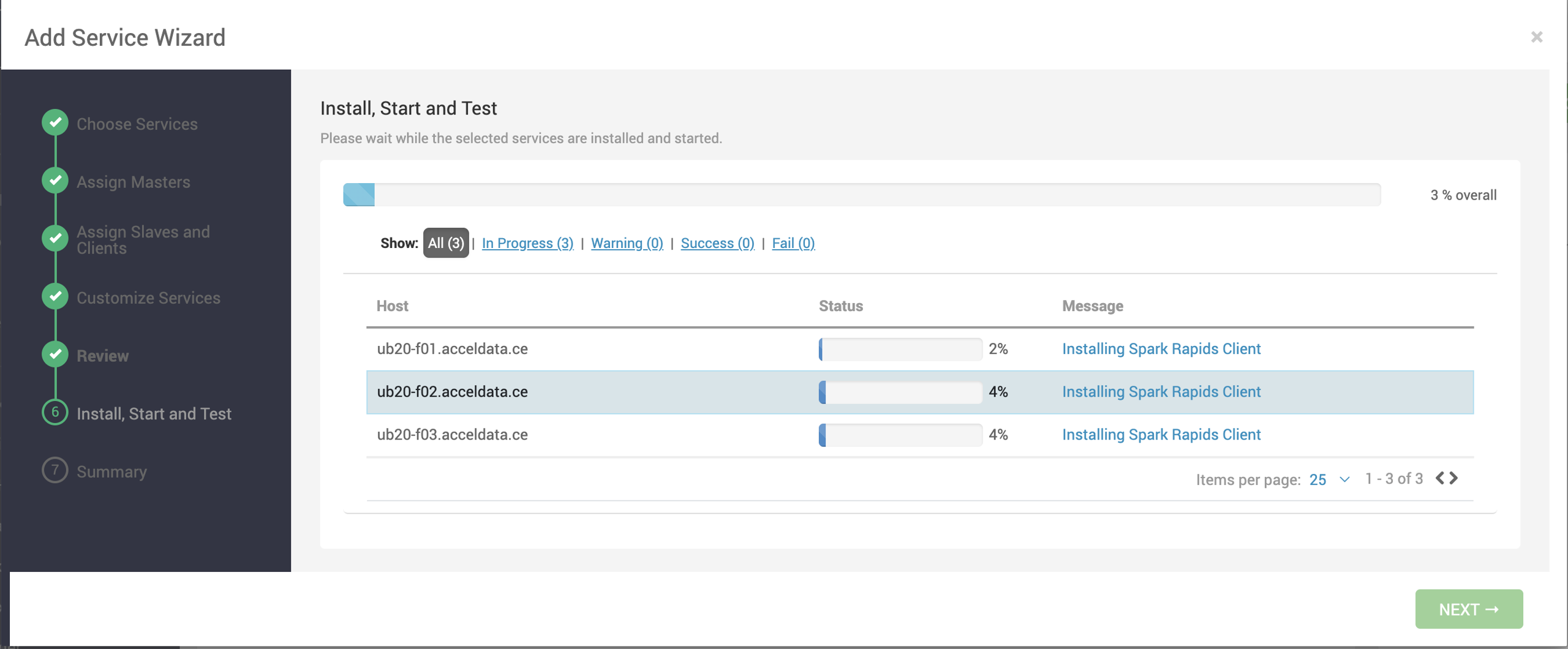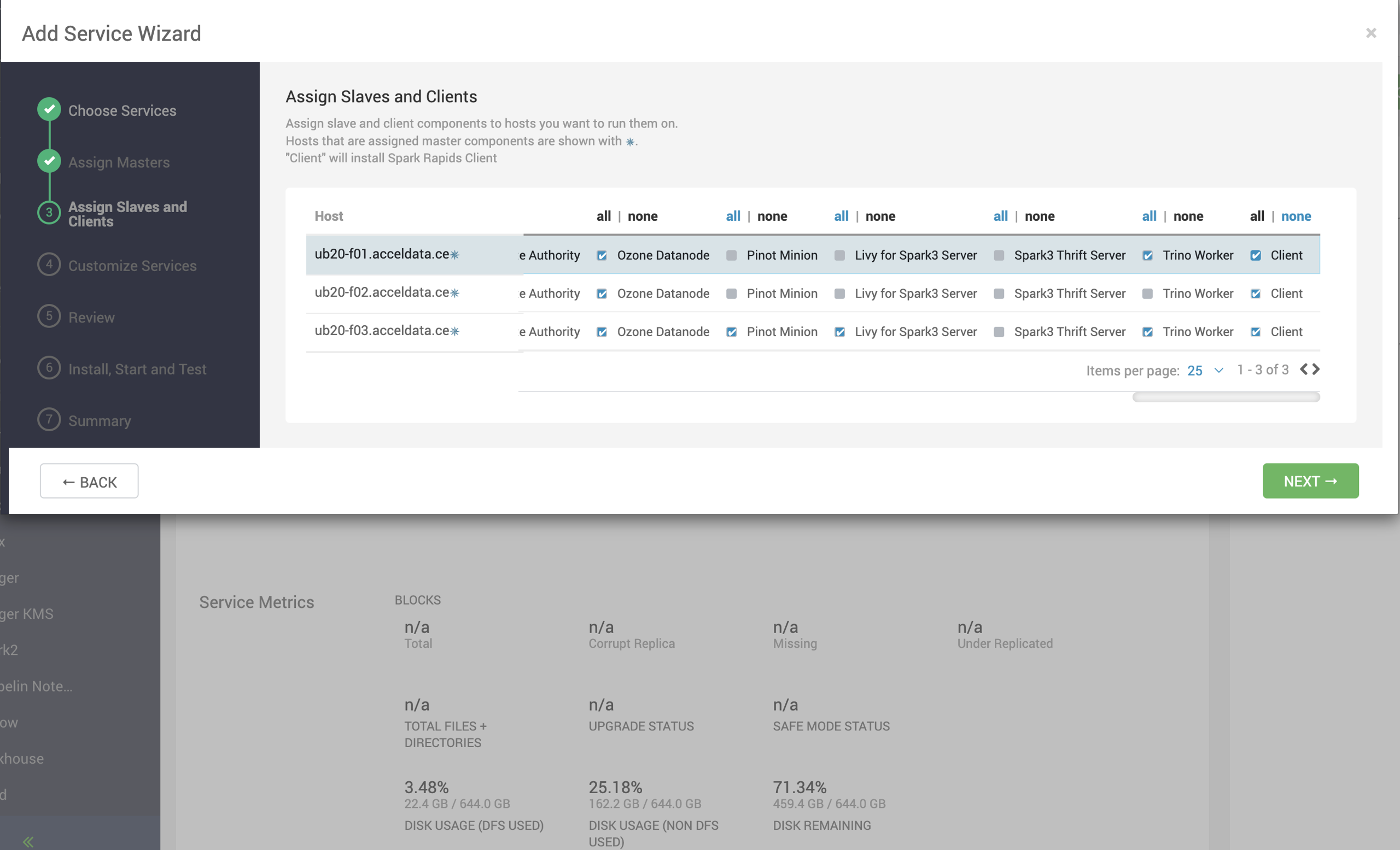 - On the Assign Slaves and Clients page, select nodes where you want to install the Spark Rapid Client and click Next.
