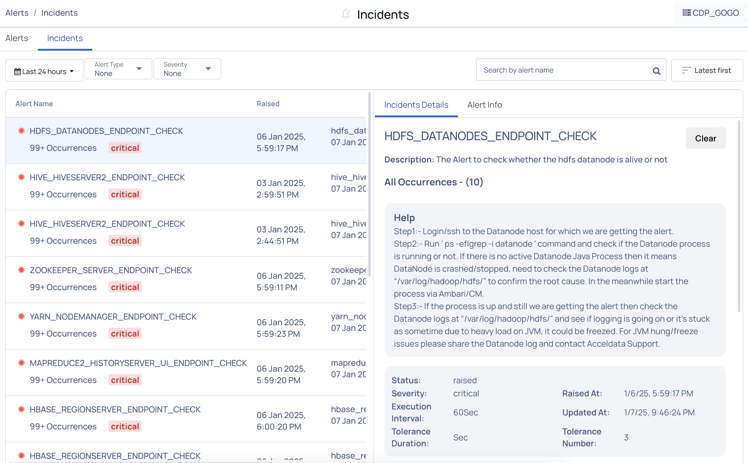 The Incident Details page provides comprehensive information, including the reason for raising the incident, the number of occurrences, its current status, severity level, timestamps for when it was raised and last updated, the execution interval, and other critical metrics. This detailed view helps you diagnose and pinpoint the root cause of the issue for faster resolution, while Acceldata Pulse provides actionable recommendations to effectively mitigate the incident and expedite the resolution process.