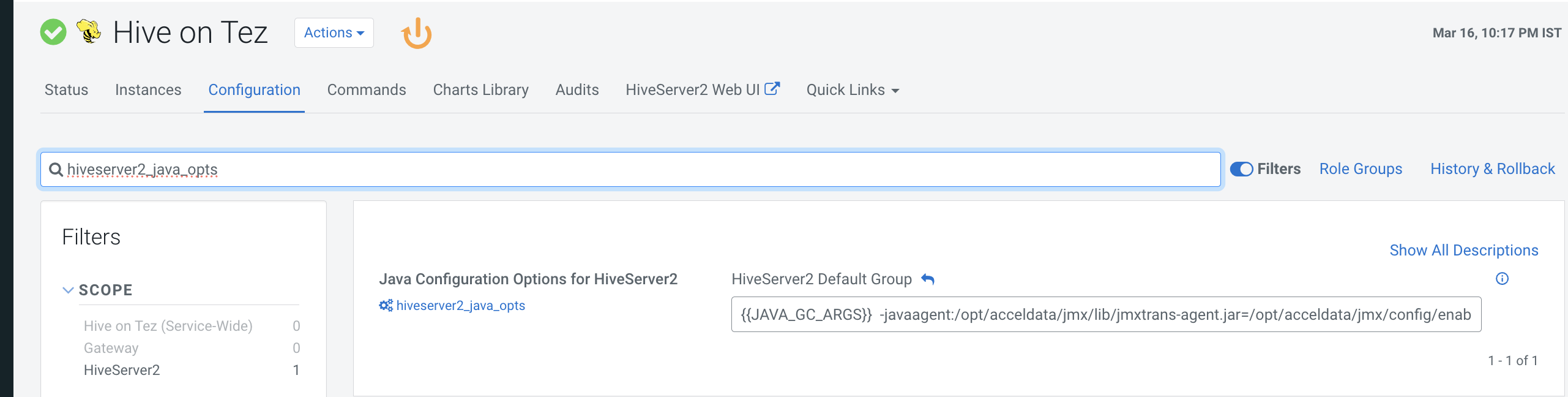export HADOOP_OPTS="$HADOOP_OPTS -javaagent:/opt/acceldata/jmx/lib/jmxtrans-agent.jar=/opt/acceldata/jmx/config/enabled/vm_hive_server.xml"Hive on Tez