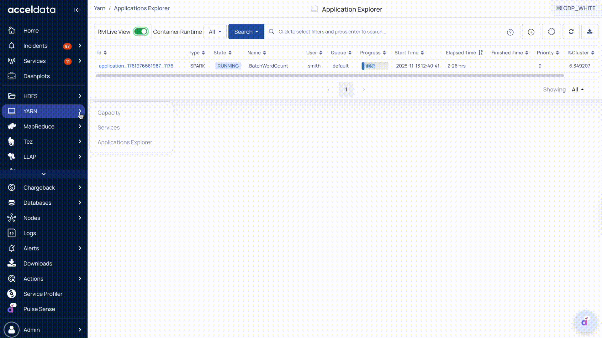 - In the Pulse UI, select YARN from the left navigation bar > Application Explorer.