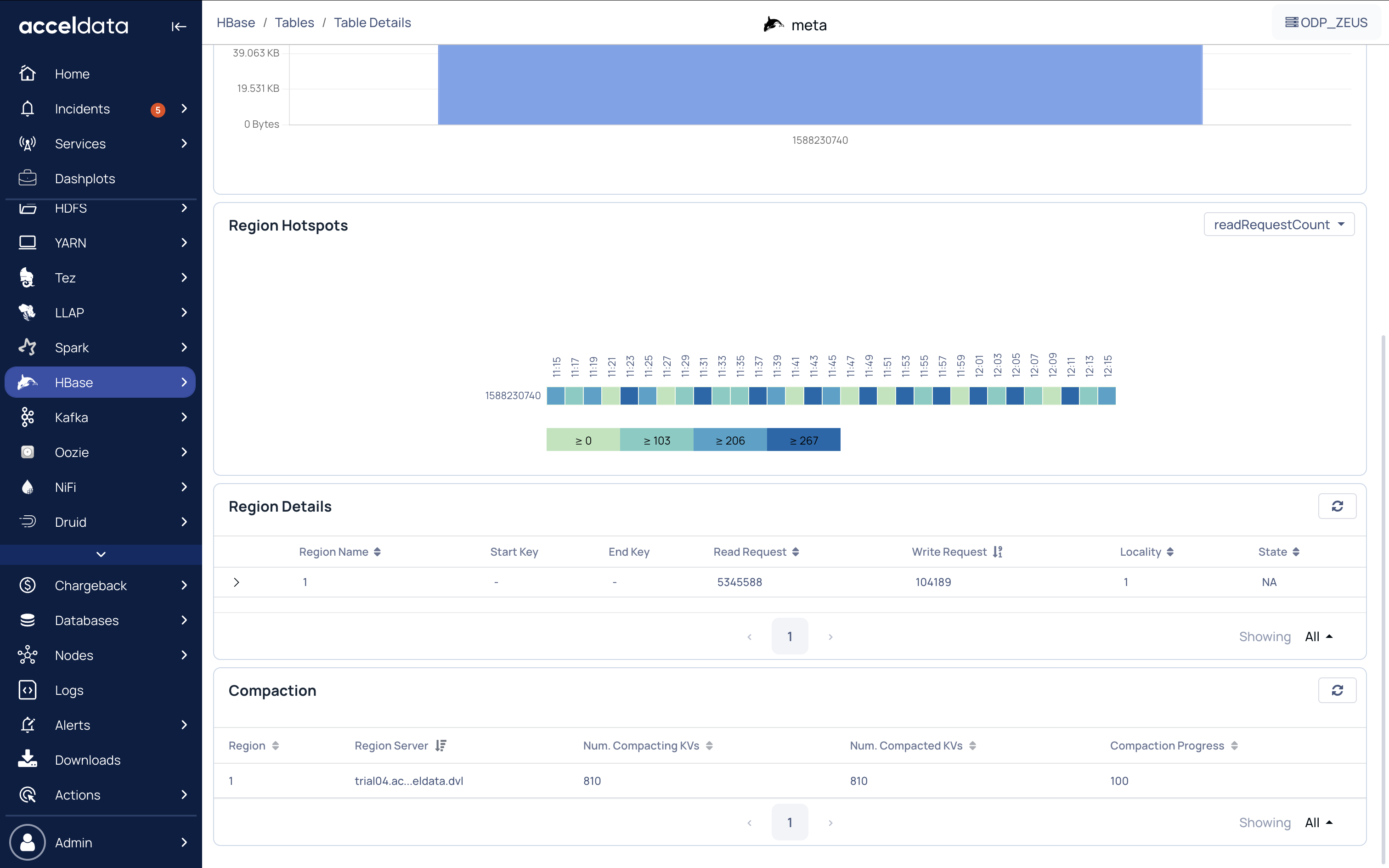 Region size for table displays a bar chart describing the region size per host in the table. Hover over each bar in the chart to view the region Id and region size.