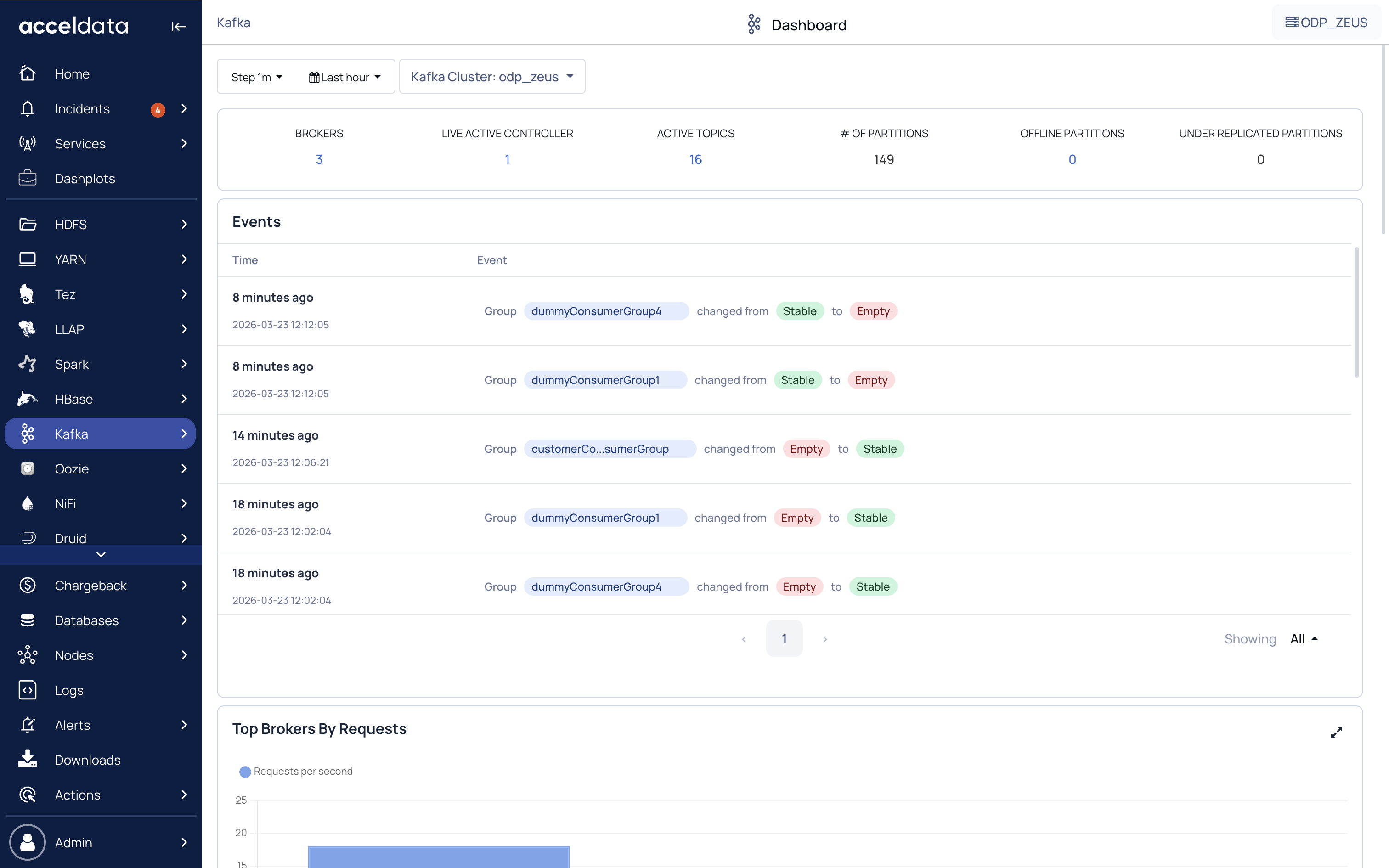 Click on the Kafka --> Dashboard in the left pane to access the Kafka dashboard. The Dashboard lets you monitor Kafka based clusters in detail.