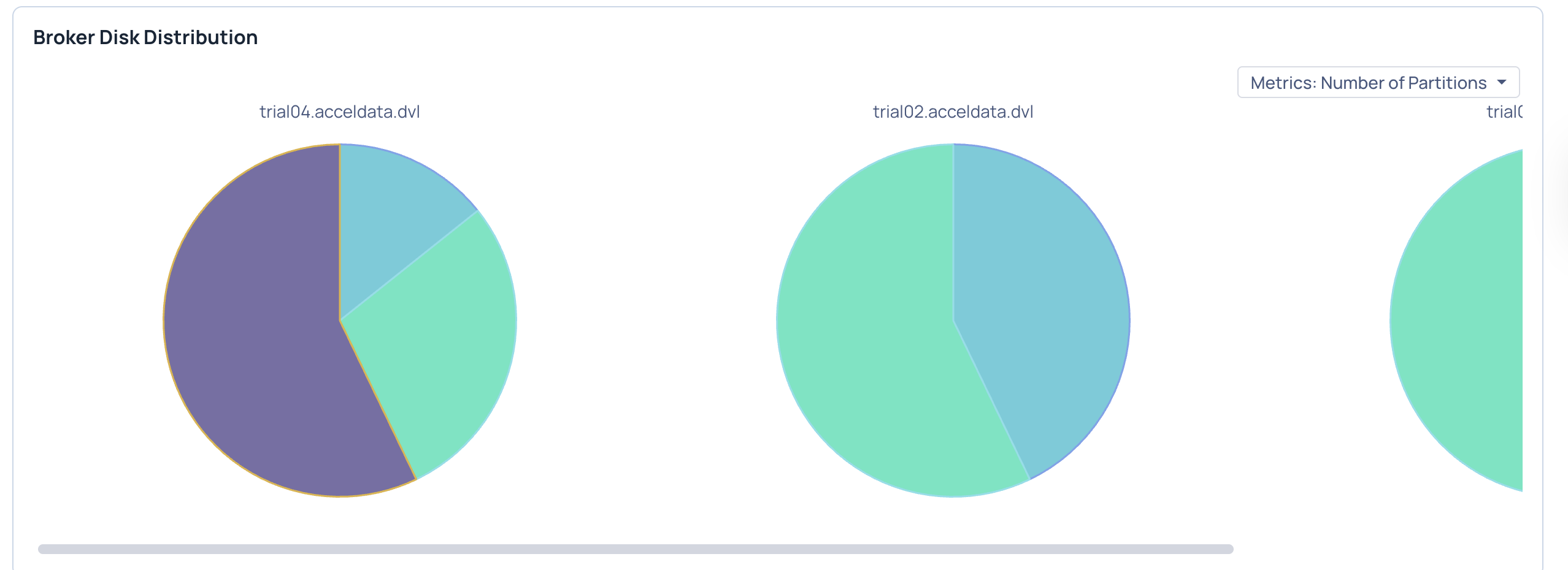 The pie chart displays the number of disks, number of partitions in the disk, and the size of the respective disk partition for a particular broker ID at topic level.