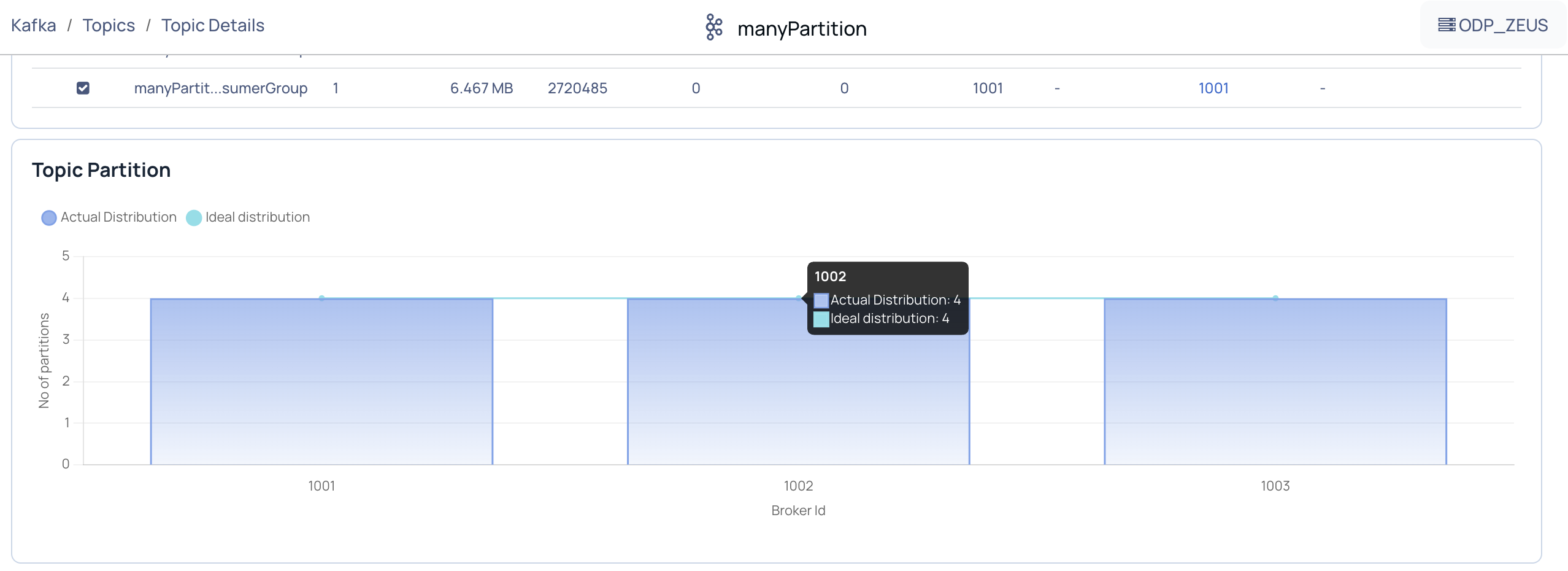The bar chart displays actual and ideal number of topic partitions for a particular broker ID.