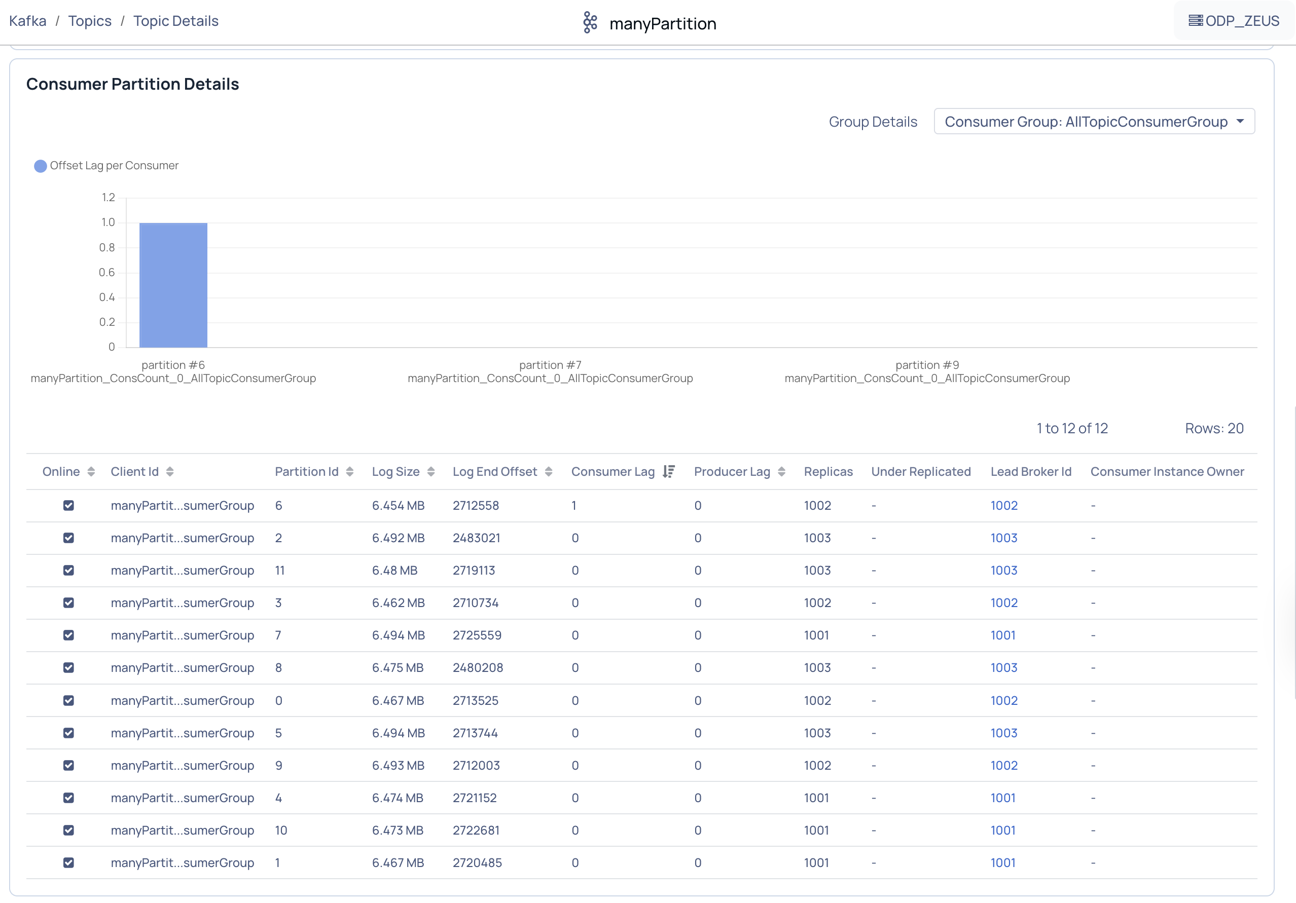 This graph displays the number of records a partition of a consumer group is lagging behind by a producer. This data is represented on the basis of Offset lag per consumer. Hover over the bars chart to see the exact number of records that are lagging.