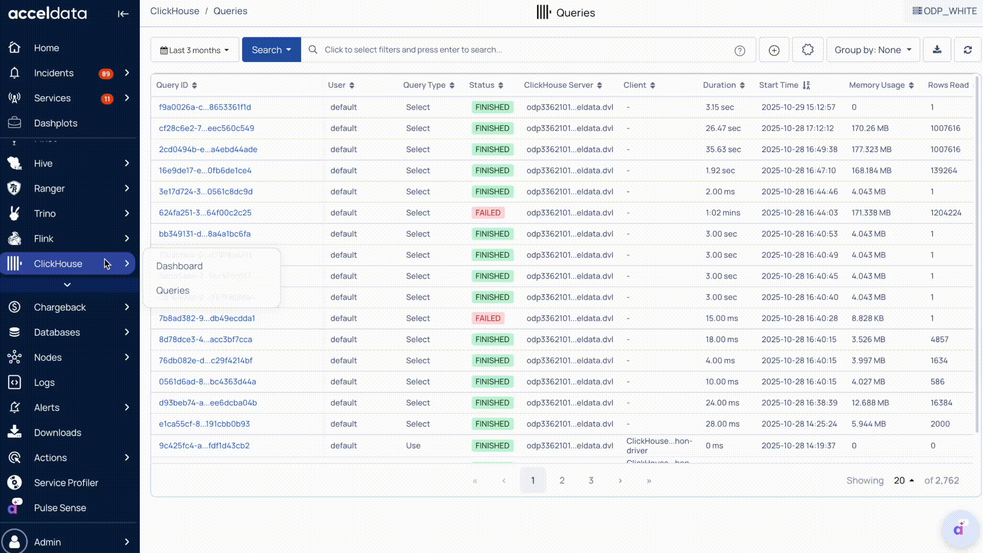 The Queries page in Pulse provides an overview of all executed ClickHouse queries, displaying their status, performance metrics, resource usage, etc.