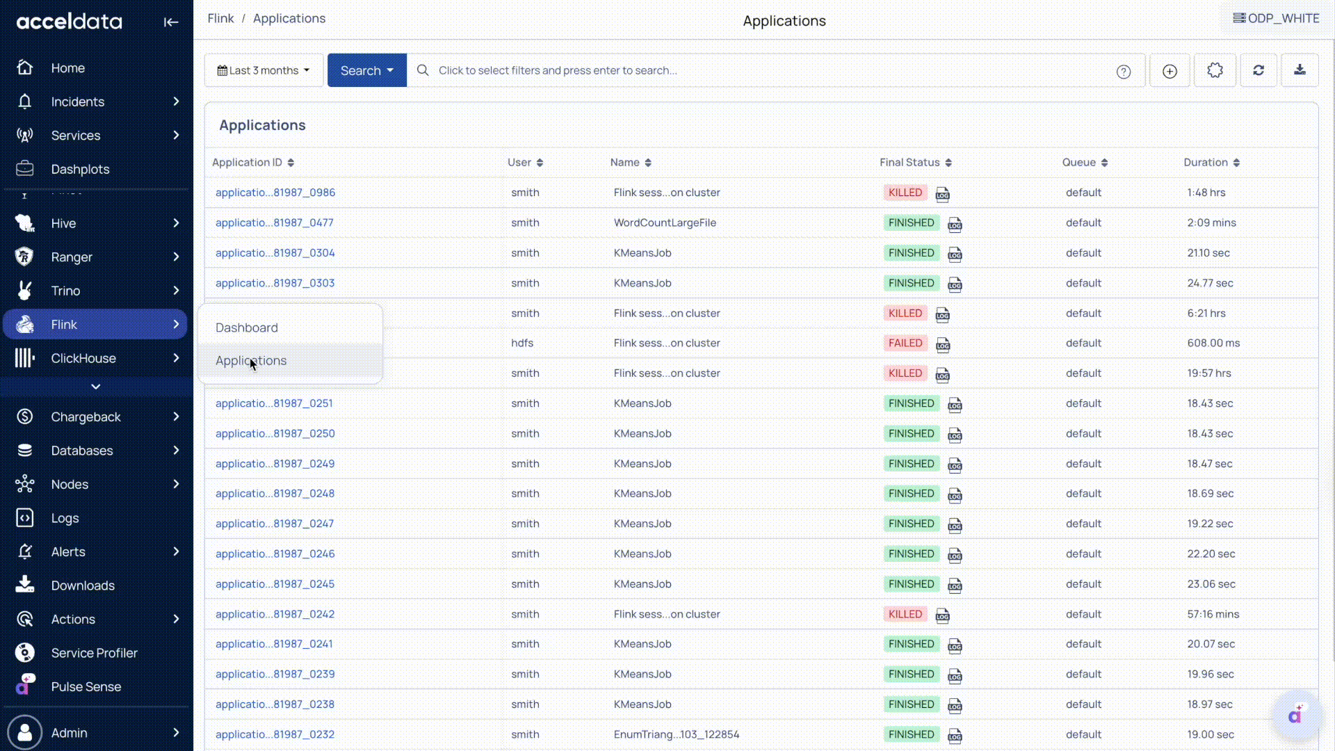 The Flink Applications page in Pulse provides an overview of all executed Flink applications, displaying their status, user, queue, and execution details in real time.