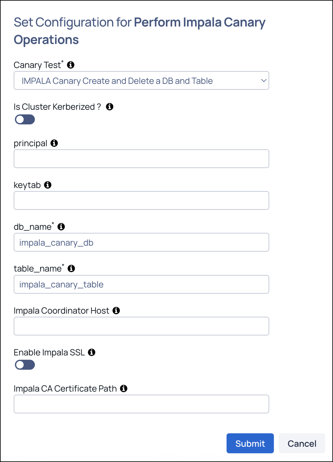 - Impala Coordinator Host: Hostname of the Impala coordinator node the canary connects to for running the test.