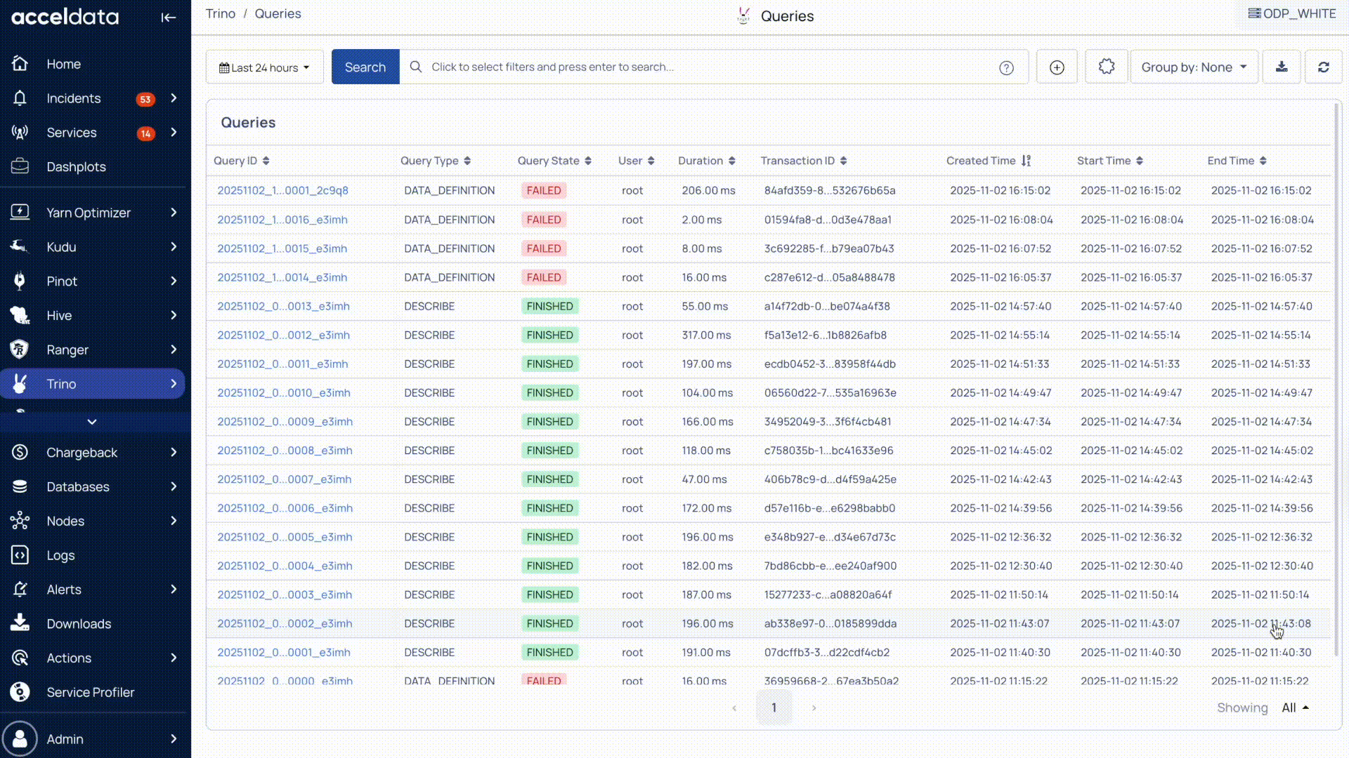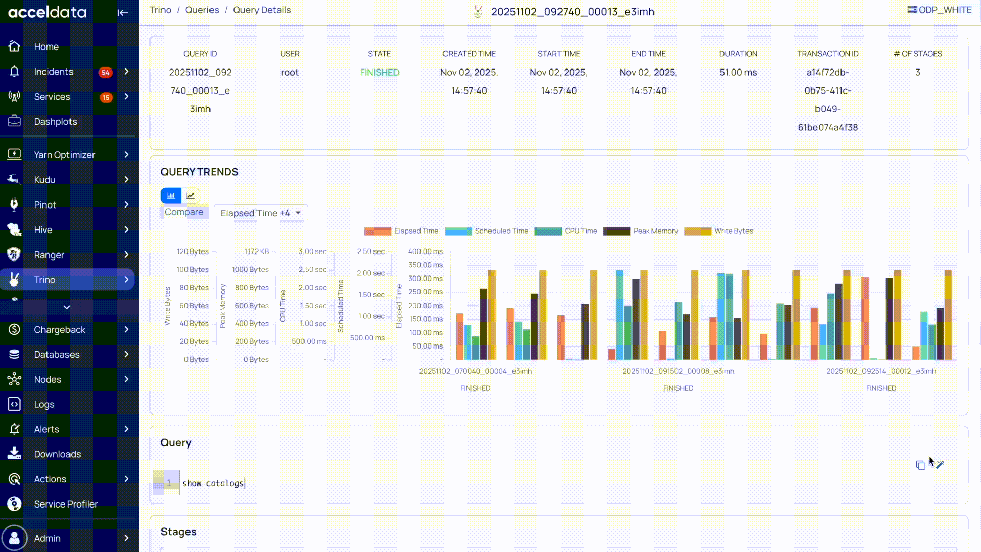 The Trino Query Details page provides a comprehensive view of each executed Trino query, including the SQL statement, execution metrics, resource usage, and the query execution plan.