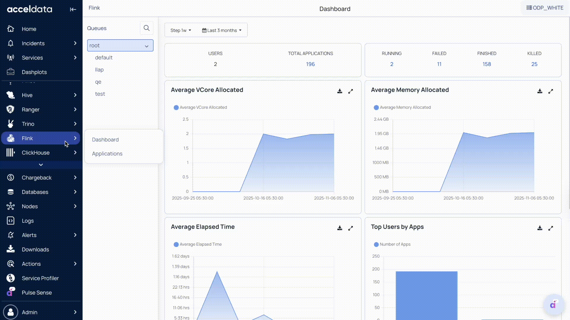 The Flink Dashboard in Pulse provides a real-time summary of Flink applications and visualizes resource utilization and execution performance across queues and users.