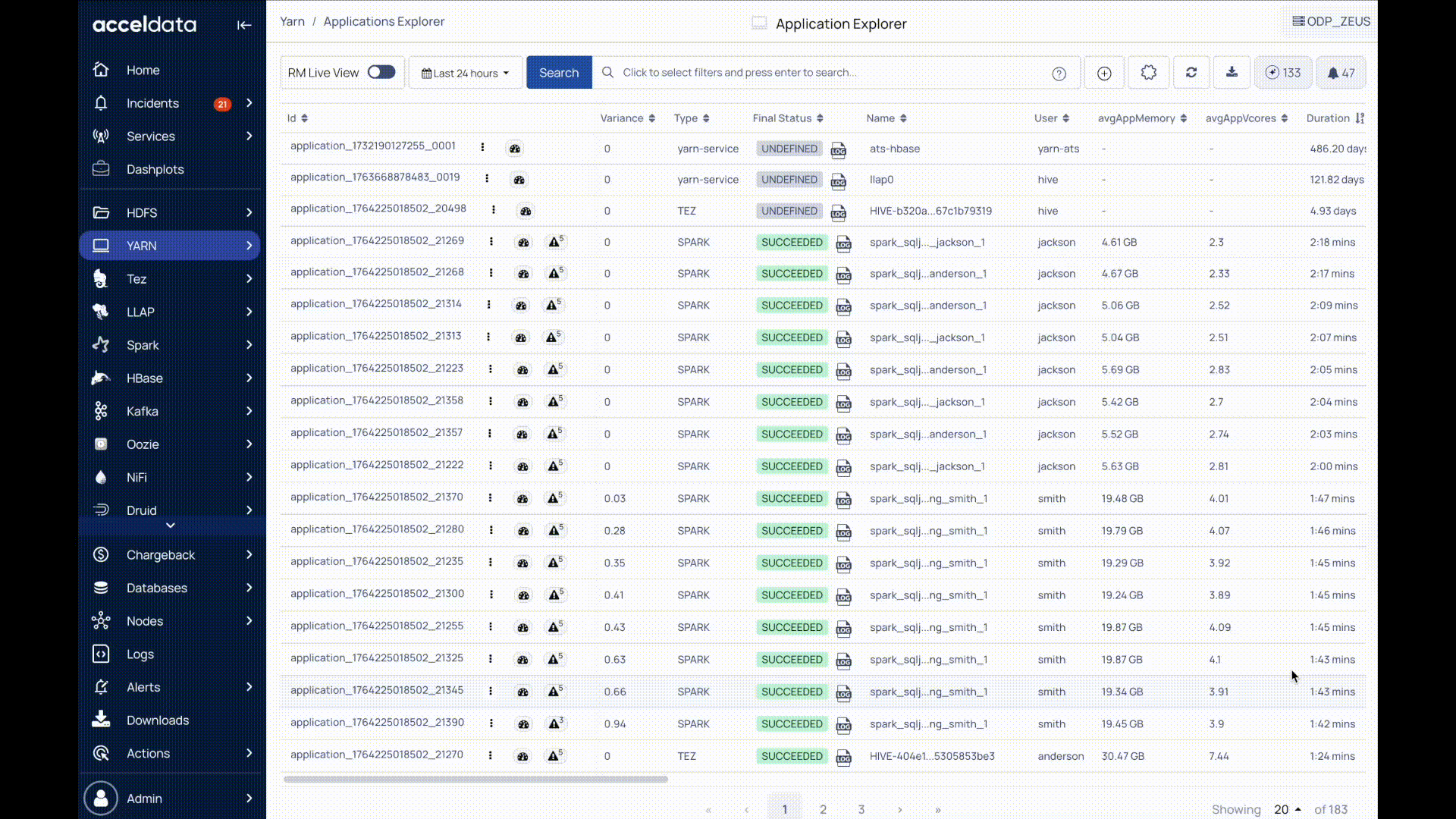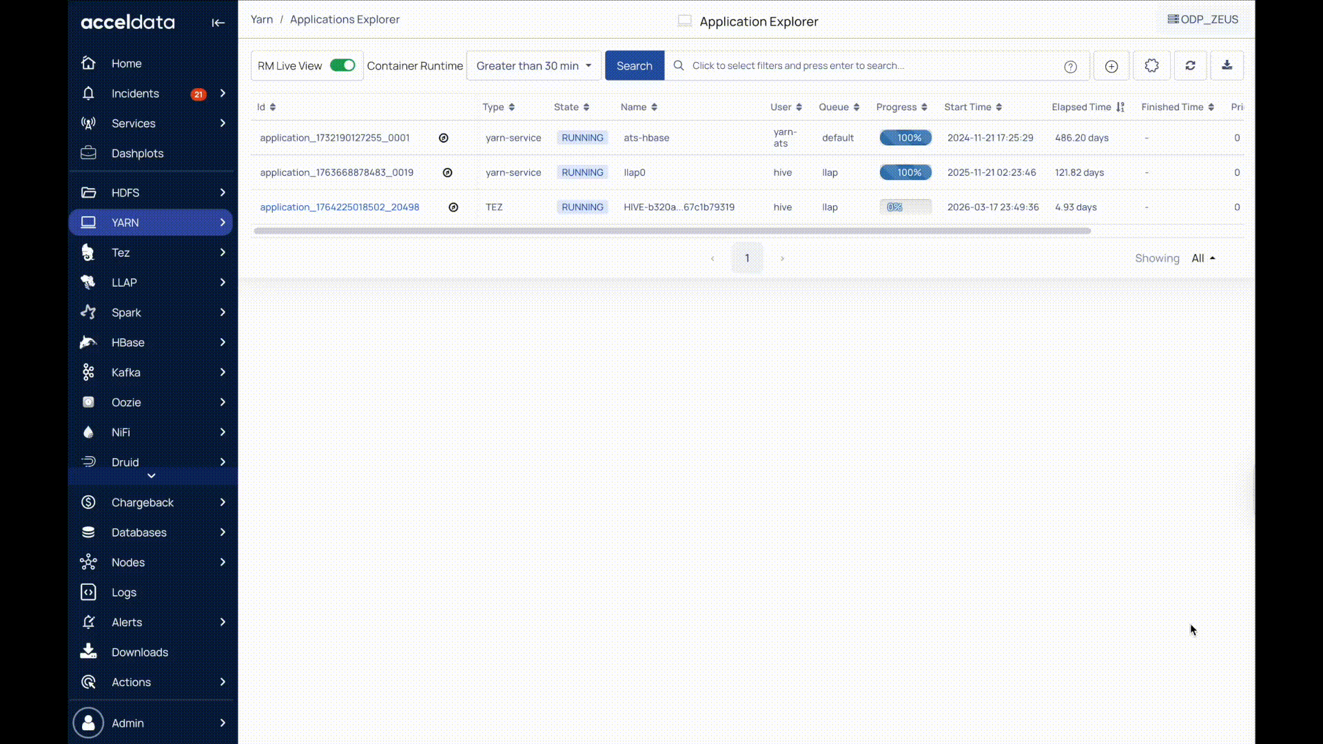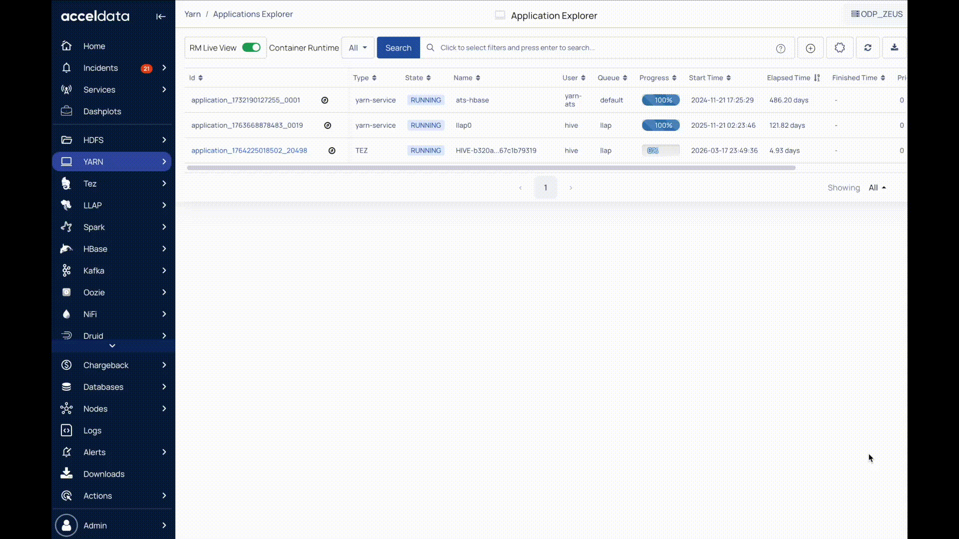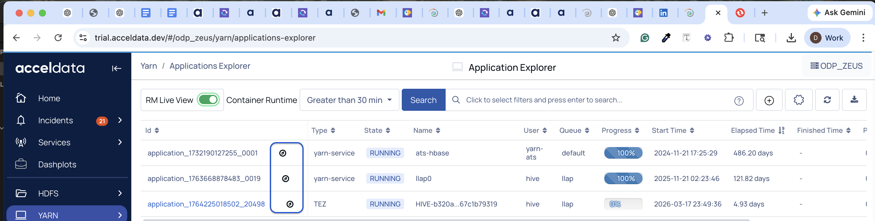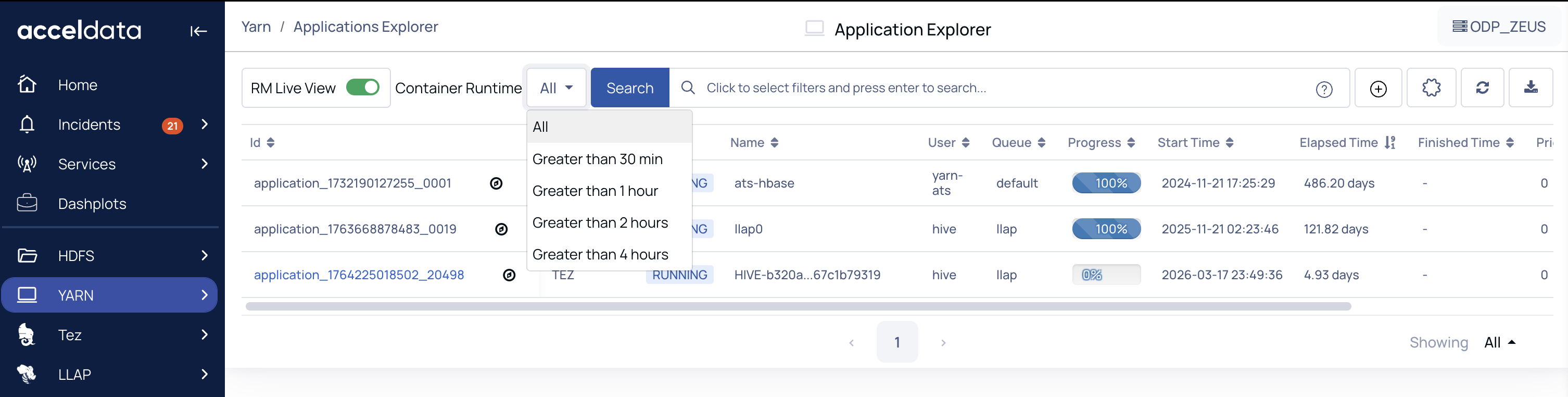 The Application Explorer board displays the status of YARN-based applications. This dashboard allows you to accomplish the following.