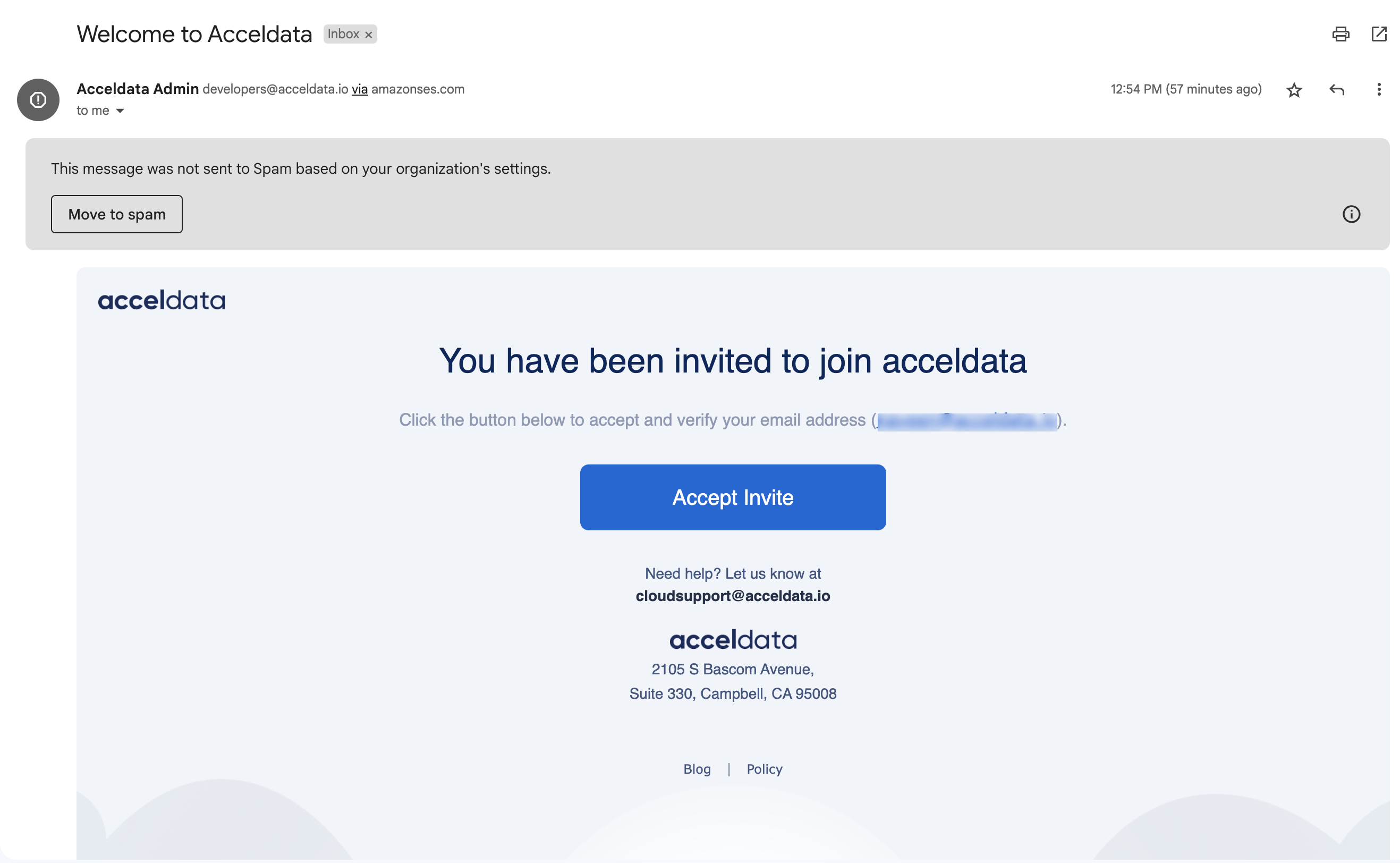 - Open the email received from Acceldata Admin and click the Accept Invite button.