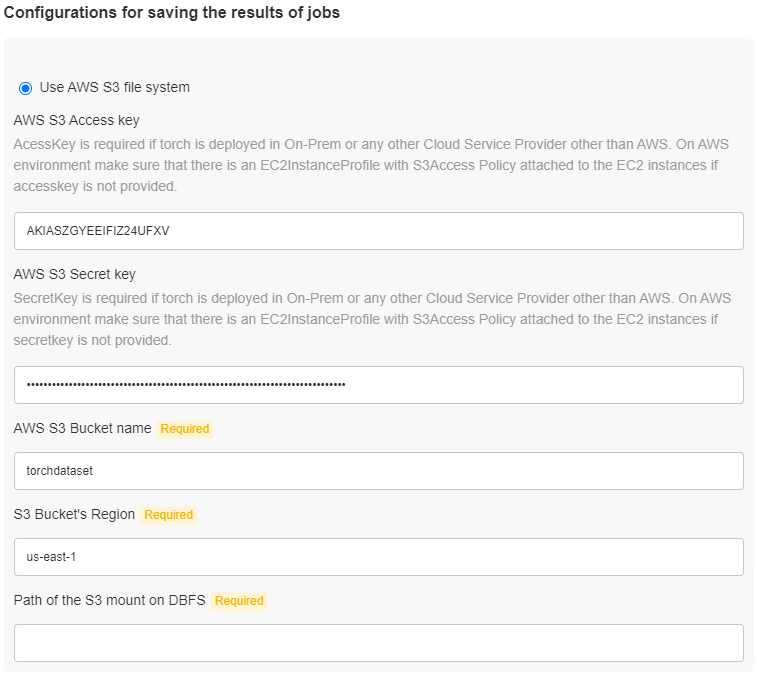 - AWS S3 Bucket name: Bucket name for where the job results are to be stored