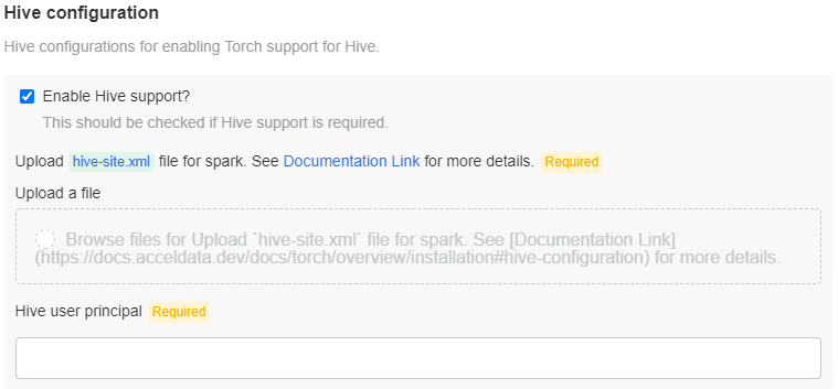 Check the Enable Hive support? checkbox, if Hive support is required. Upload the hive-site.xml file to the specified location. Also, enter the Hive user principal.