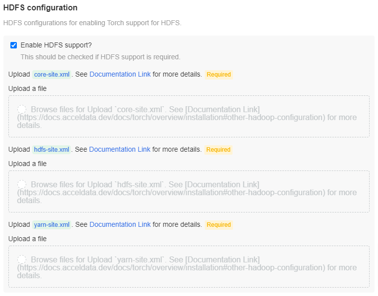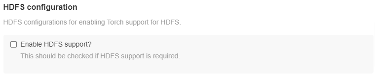 Check the Enable HDFS support? checkbox, to enable Torch support for HDFS.