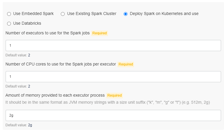 - Deploy Spark on Kubernetes: In this mode, the installer deploys Spark on Kubernetes and that is used for running the jobs. Inputs required: