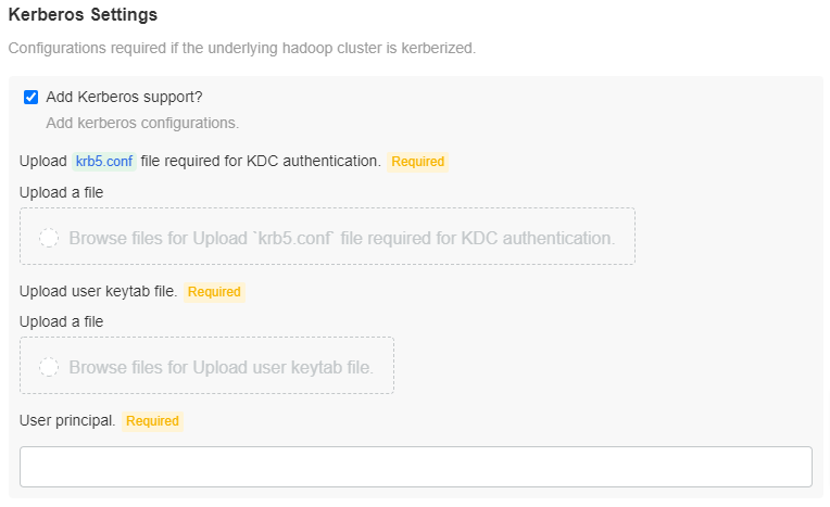 Check the Add Kerberos support? checkbox, to add Kerberos support. You must upload the krb5.conf file for KDC authentication and the user keytab file. Enter the User principal.