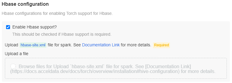 Check the Enable Hbase support? box, if Hbase support is required. Upload the hbase-site.xml file in the specified location.