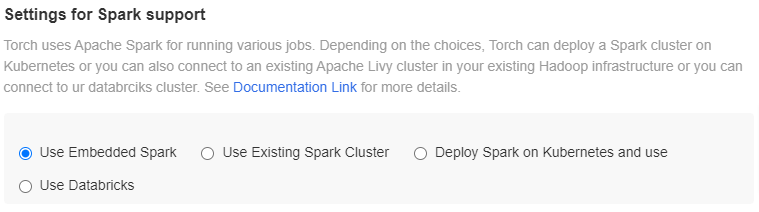 - ** Use Embedded Spark: In this mode, Torch runs jobs locally inside a service. No separate installation of configuration is required.