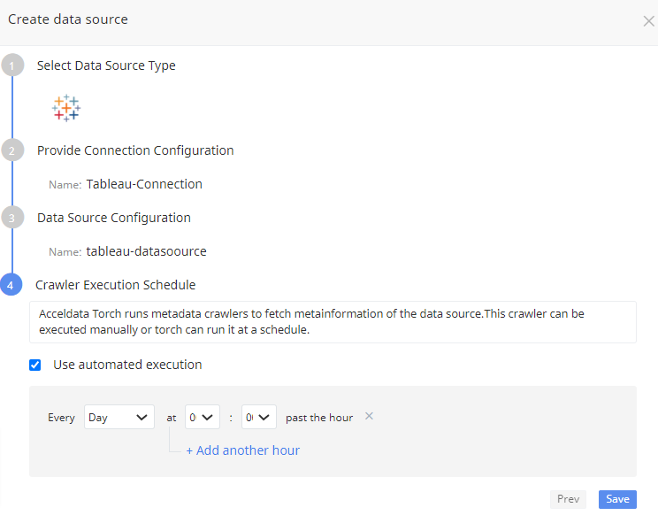 Click Use automated execution checkbox to schedule a time for Torch to run metadata crawlers to fetch meta information of the data source. To schedule, select any tag like minute, hour, day, week, month, or year.