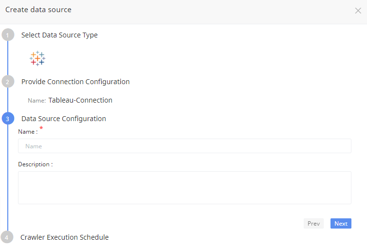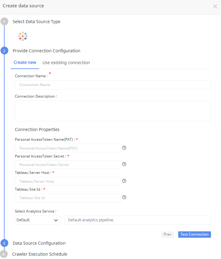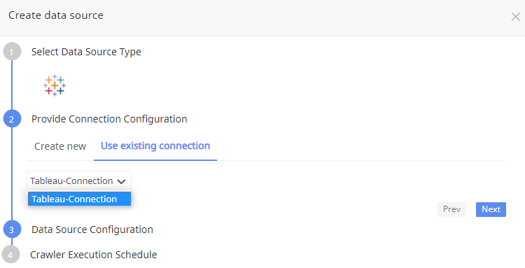 In the Data Sources window, click the Create Data Source button and select the Tableau option to create a data source. The user can either Create New Connection, or Use Existing Connection to connect to the Tableau server.