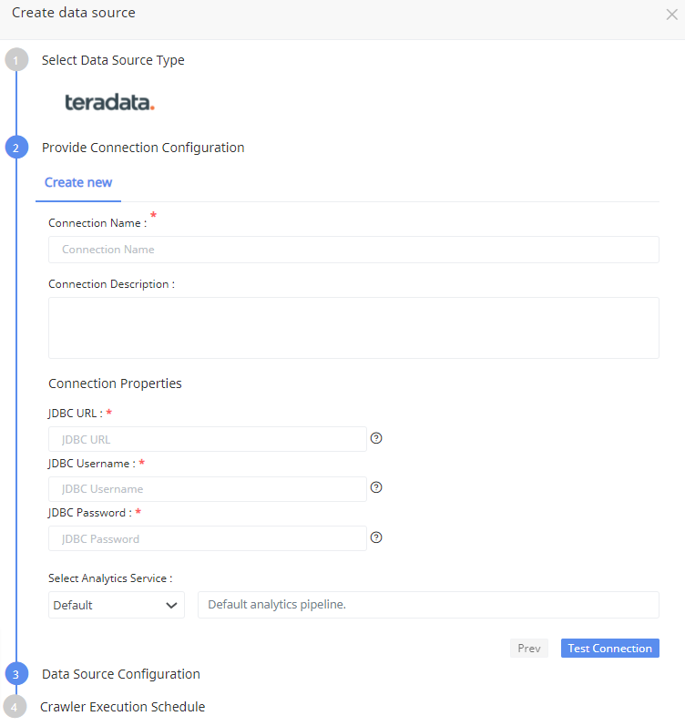 In the Data Sources window, click the Create Data Source button and select the Teradata option to create a data source. The user can Create New Connection to connect to the Teradata data source.