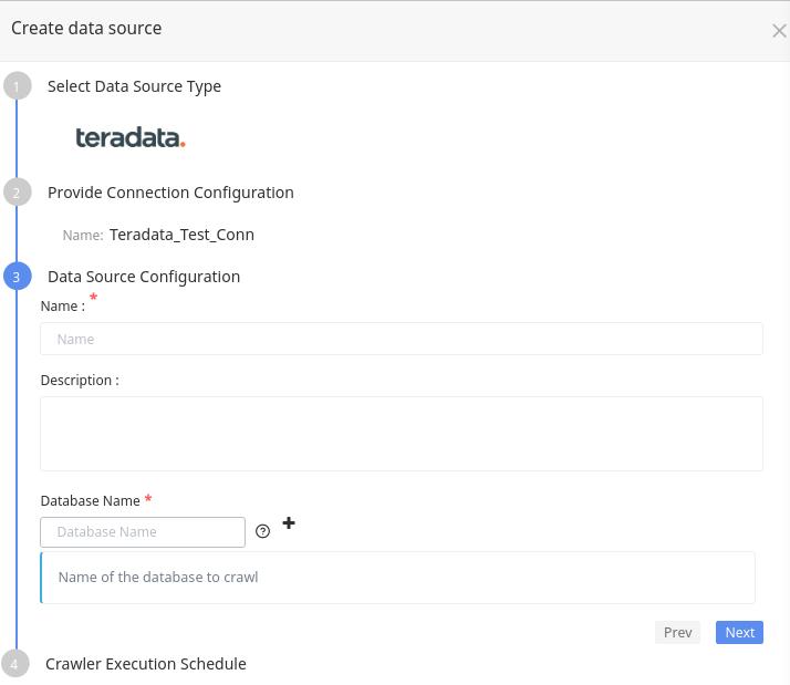 Specify a name and description for the data source configuration. Also, enter the name of the database to crawl.